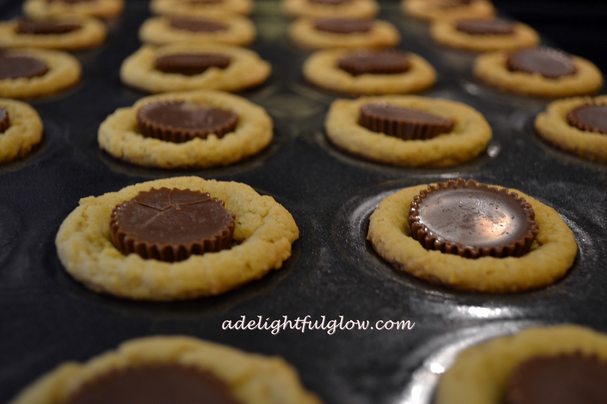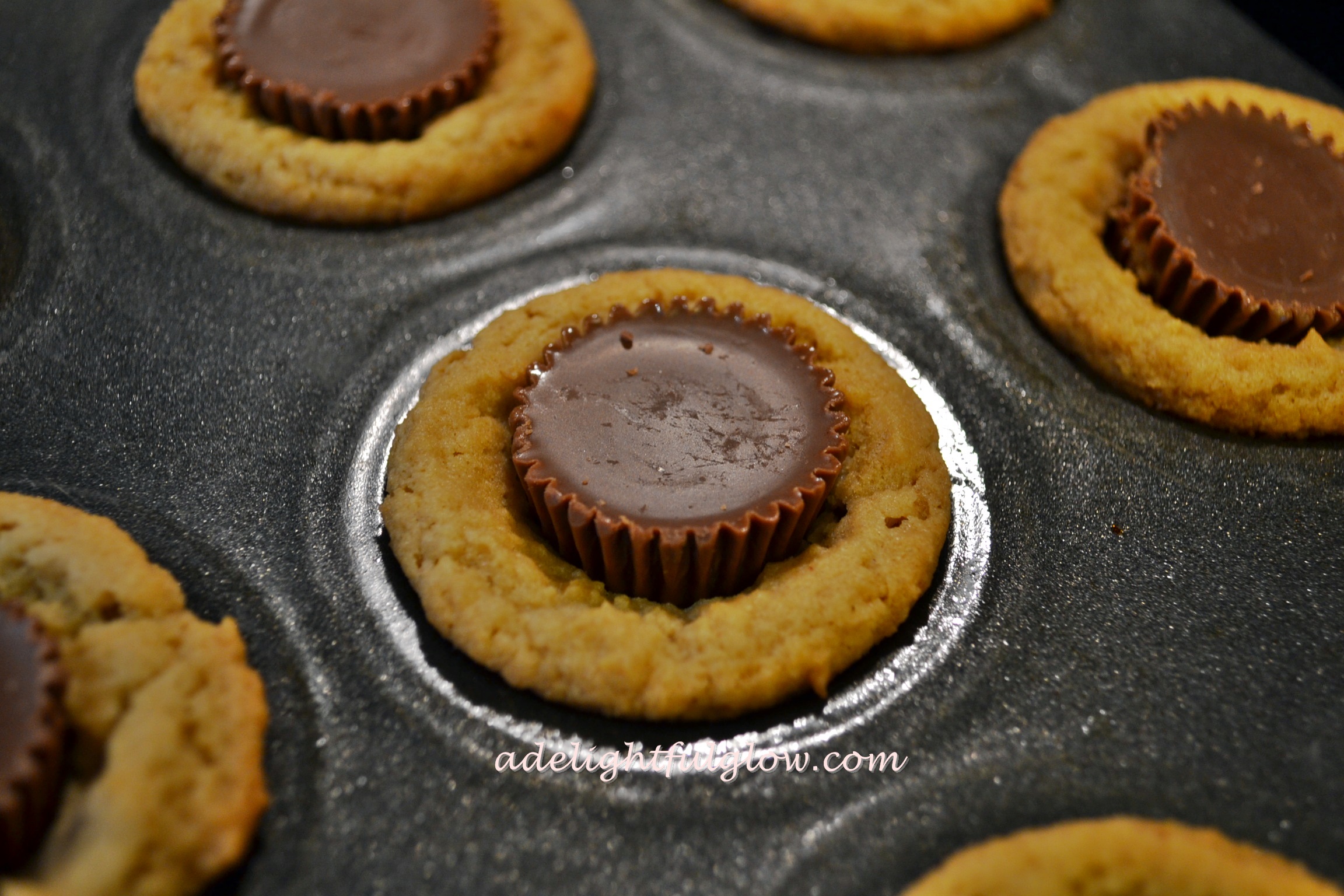 Remove from oven and immediately press peanut butter cups into each cookie crust.