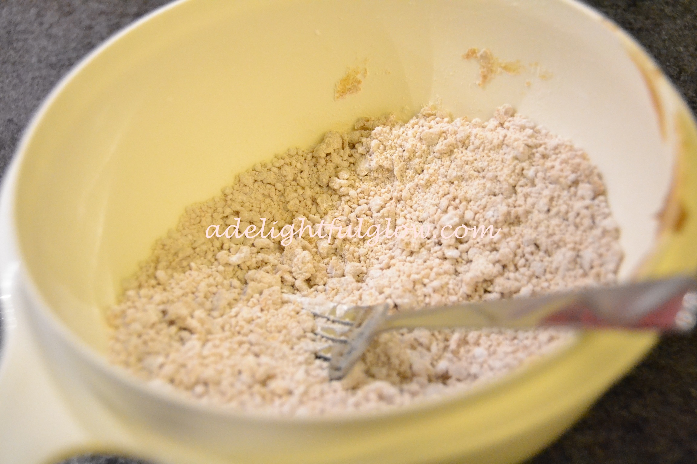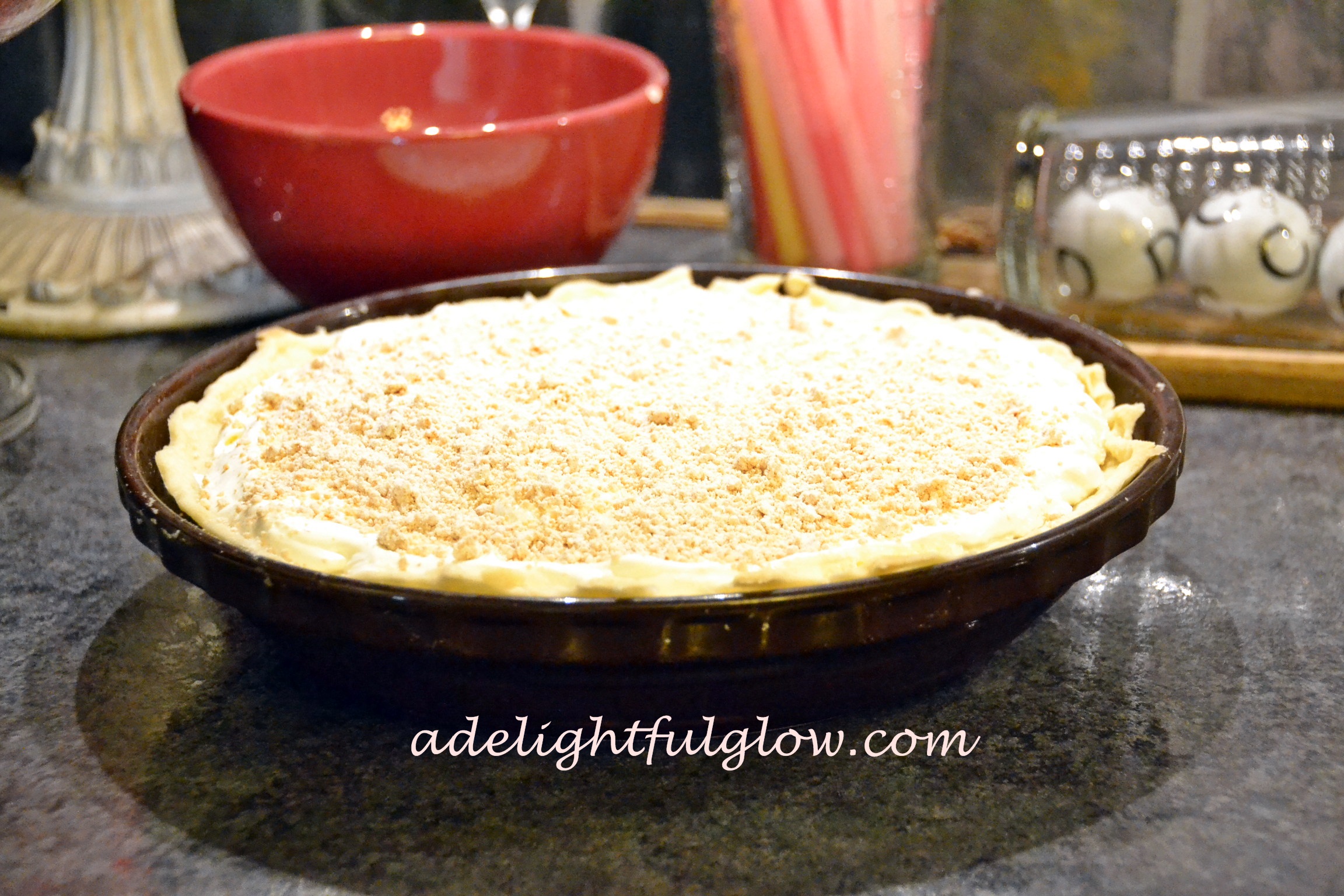 - Mix together until crumbly. Sprinkle 2/3 of crumbs into the bottom of baked pie shell. Reserve remaining crumbs for top of pie.