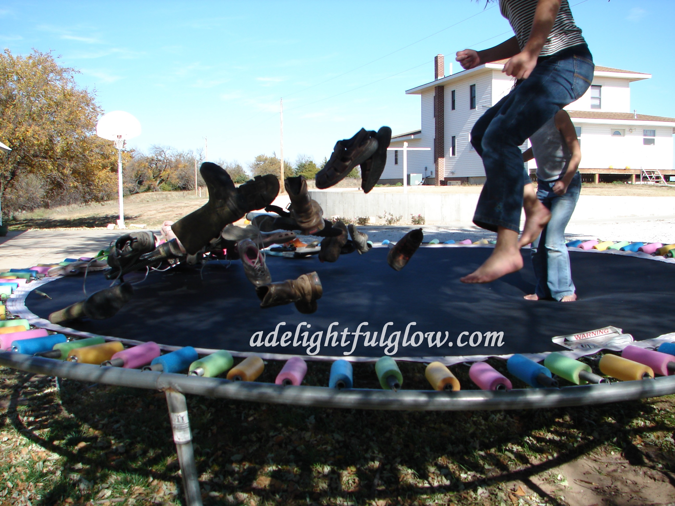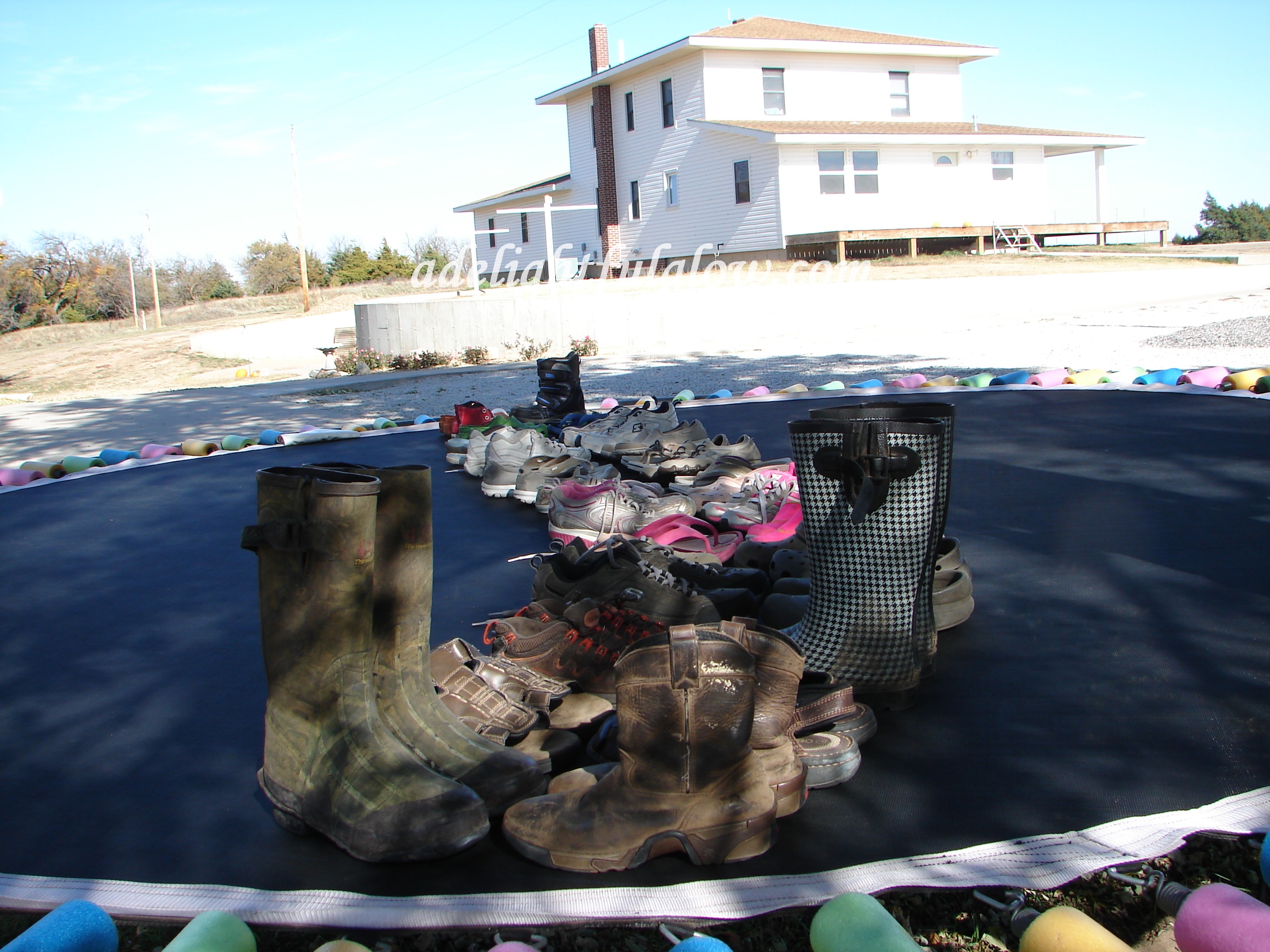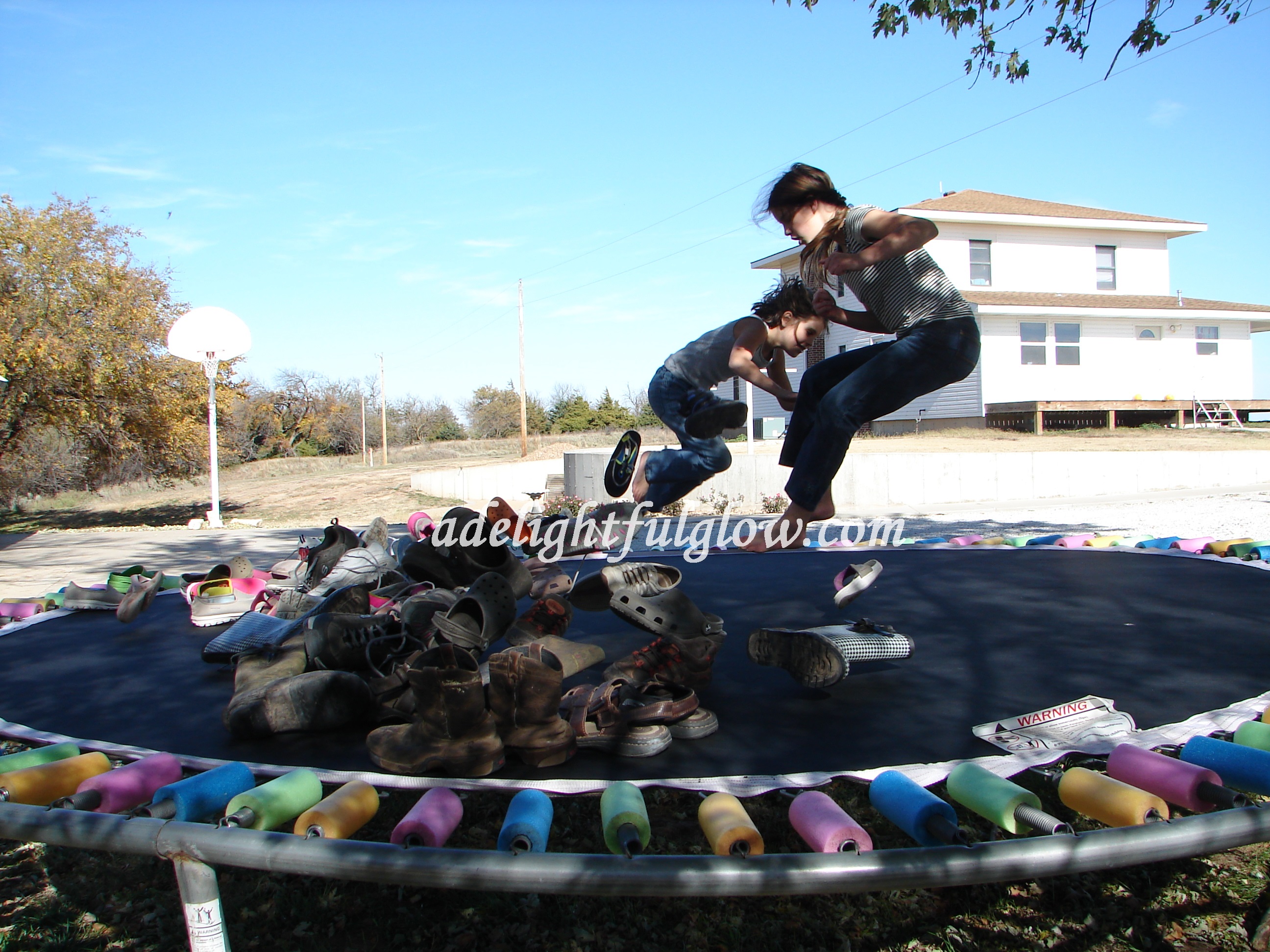 It’s rather interesting to yell out to the kiddo on the trampoline any time you need a pair of shoes so you can leave the house. You also find out that there are a lot of pairs of shoes and boots around your farm!