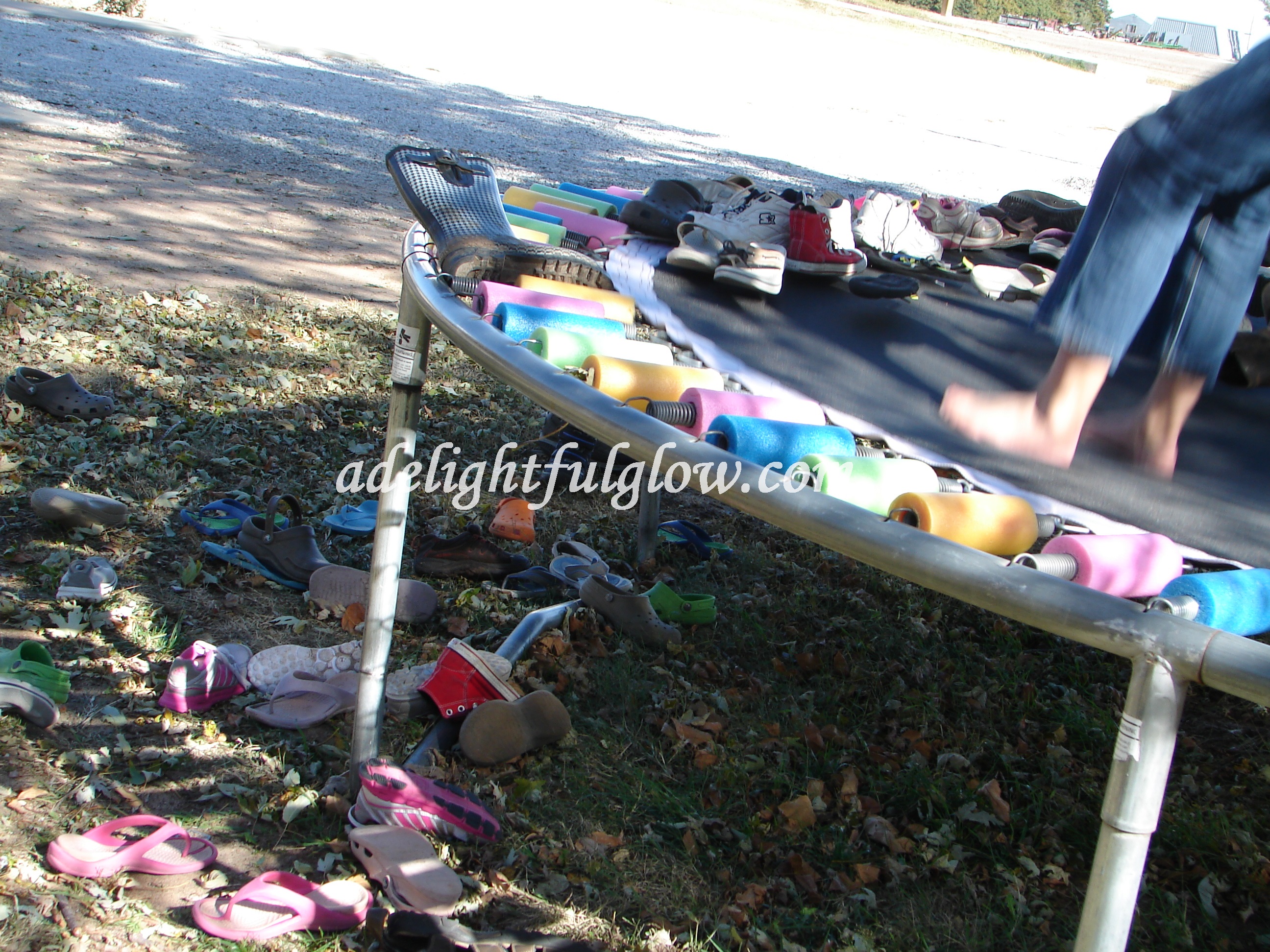There are different variations. I’ve never personally played, so I’m not exactly sure on all the rules. The object of the game is to get all the shoes “popped” off of the trampoline. The shoes are not allowed to touch you. {I’m not sure what happens if you get touched.} I will have to inquire on the rules and do an update.} I also know that there are rounds involved. You play a round and get all the shoes bounced onto the ground and then line them up for the next round.
