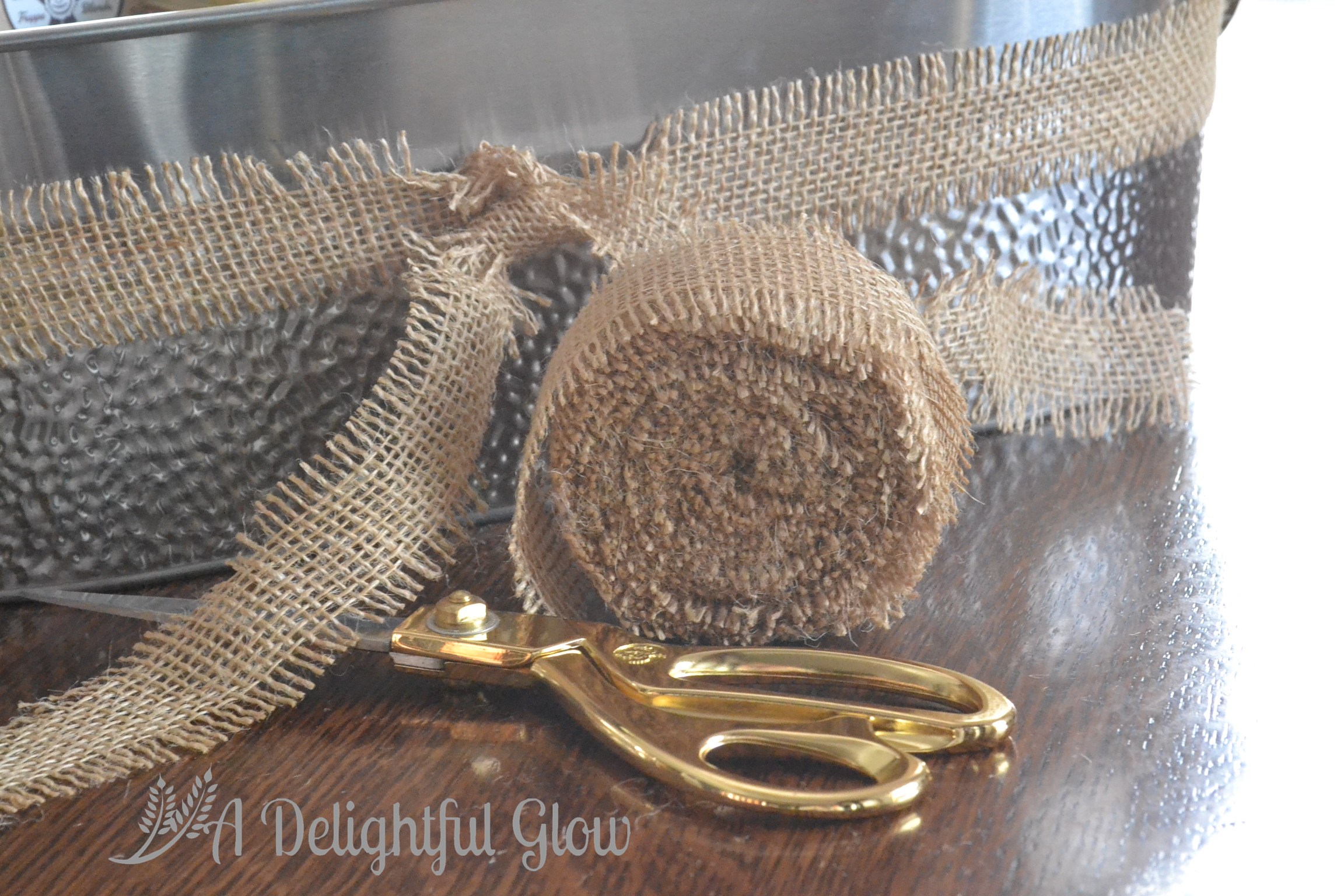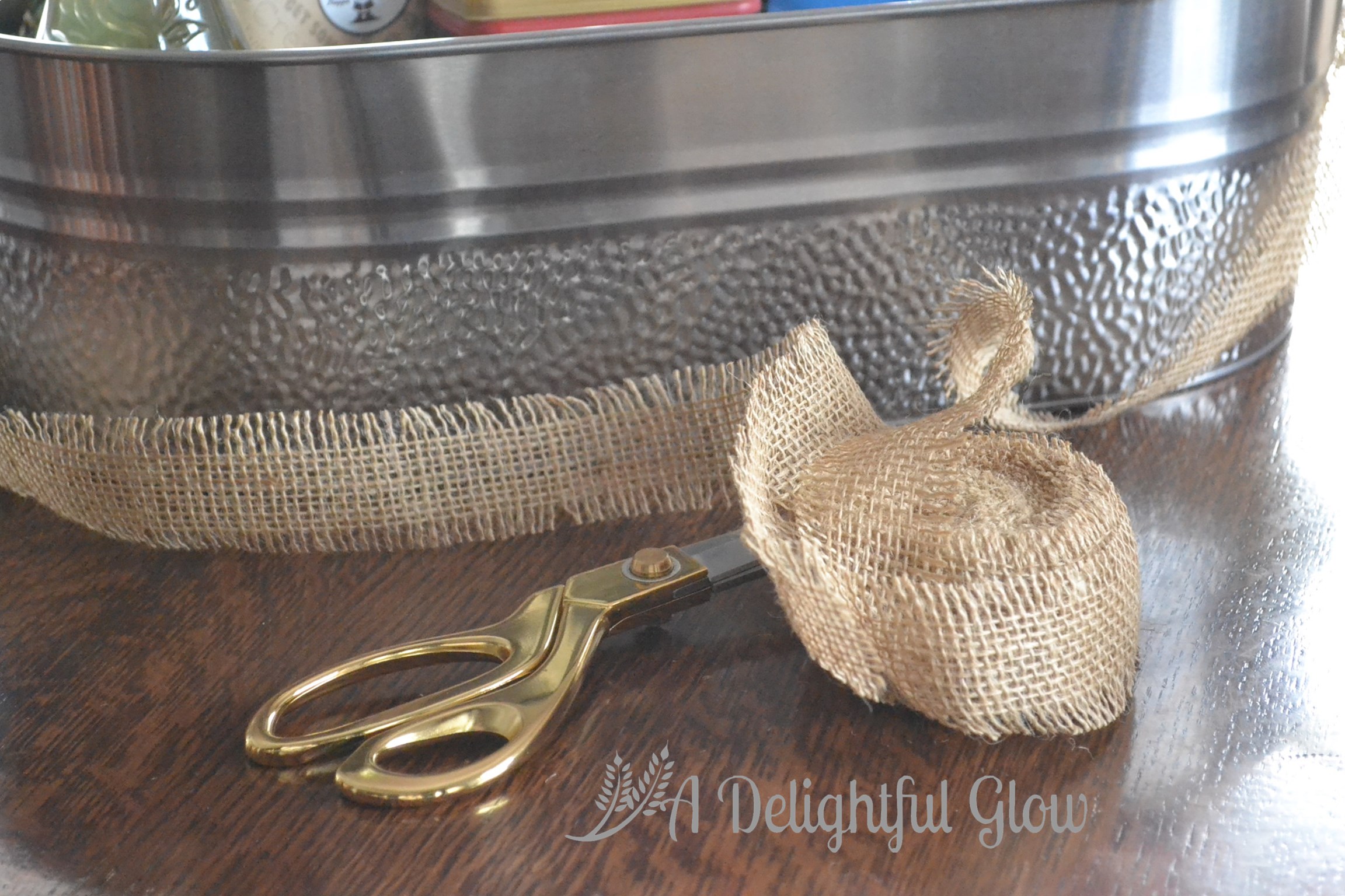 This time I used my burlap ribbon from Burlap Fabric to add some pizzazz to the outside of my metal tub. This ribbon is so fun! I am really loving it.