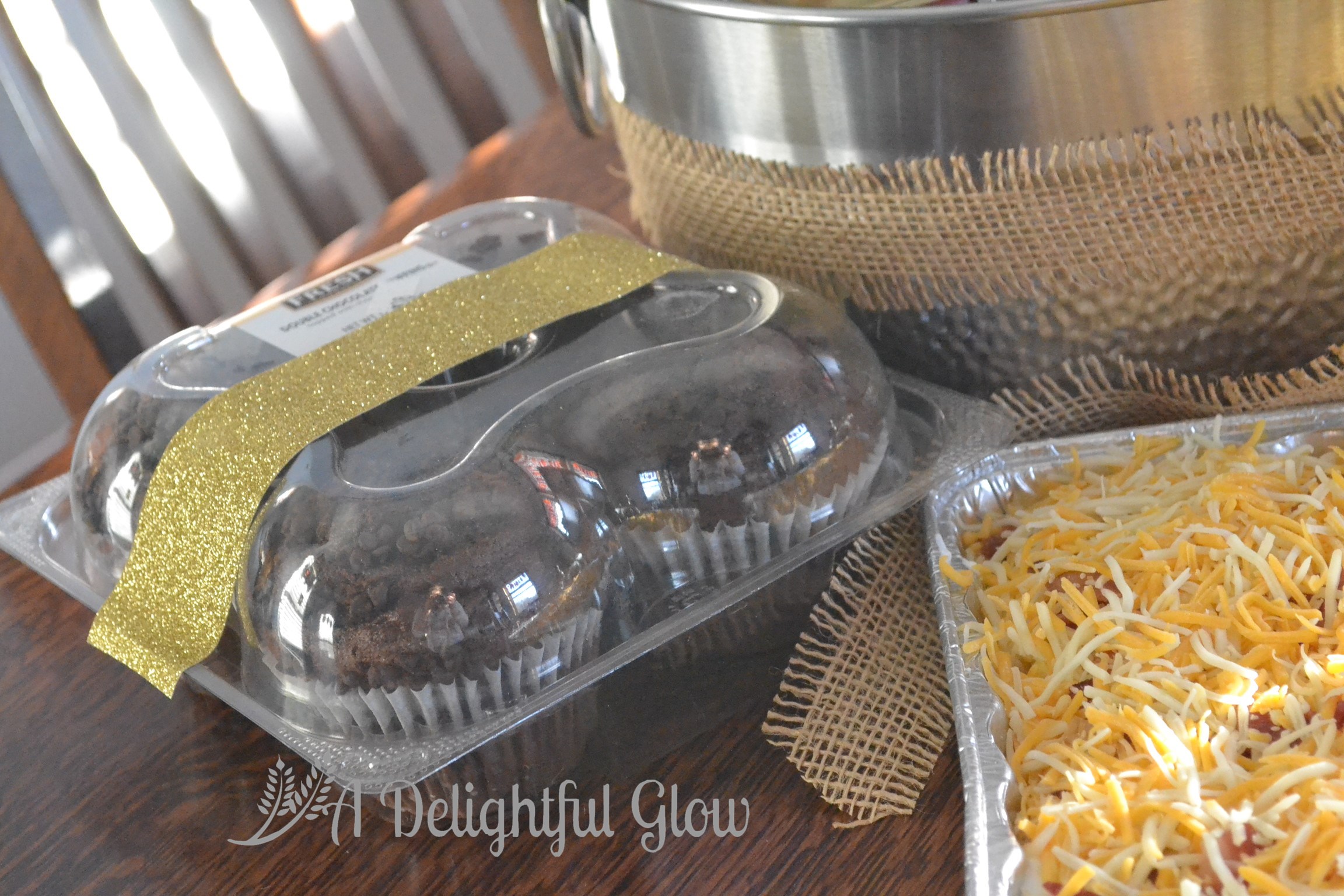 I stuck some fun gold, glitter tape on the container of decadent chocolate muffins.