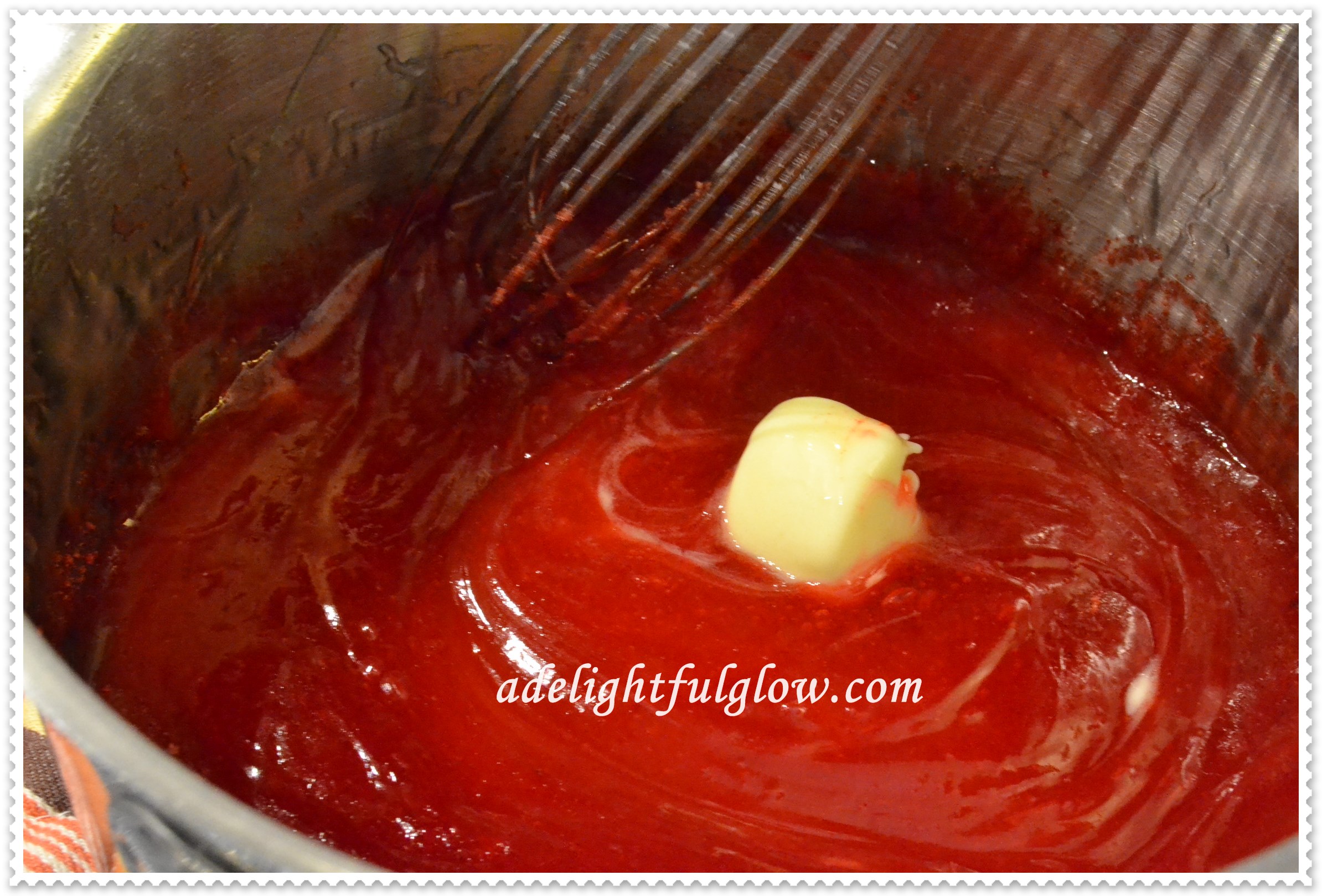 Remove from stove and add in the butter and jello. Stir until butter is melted and jello is dissolved.