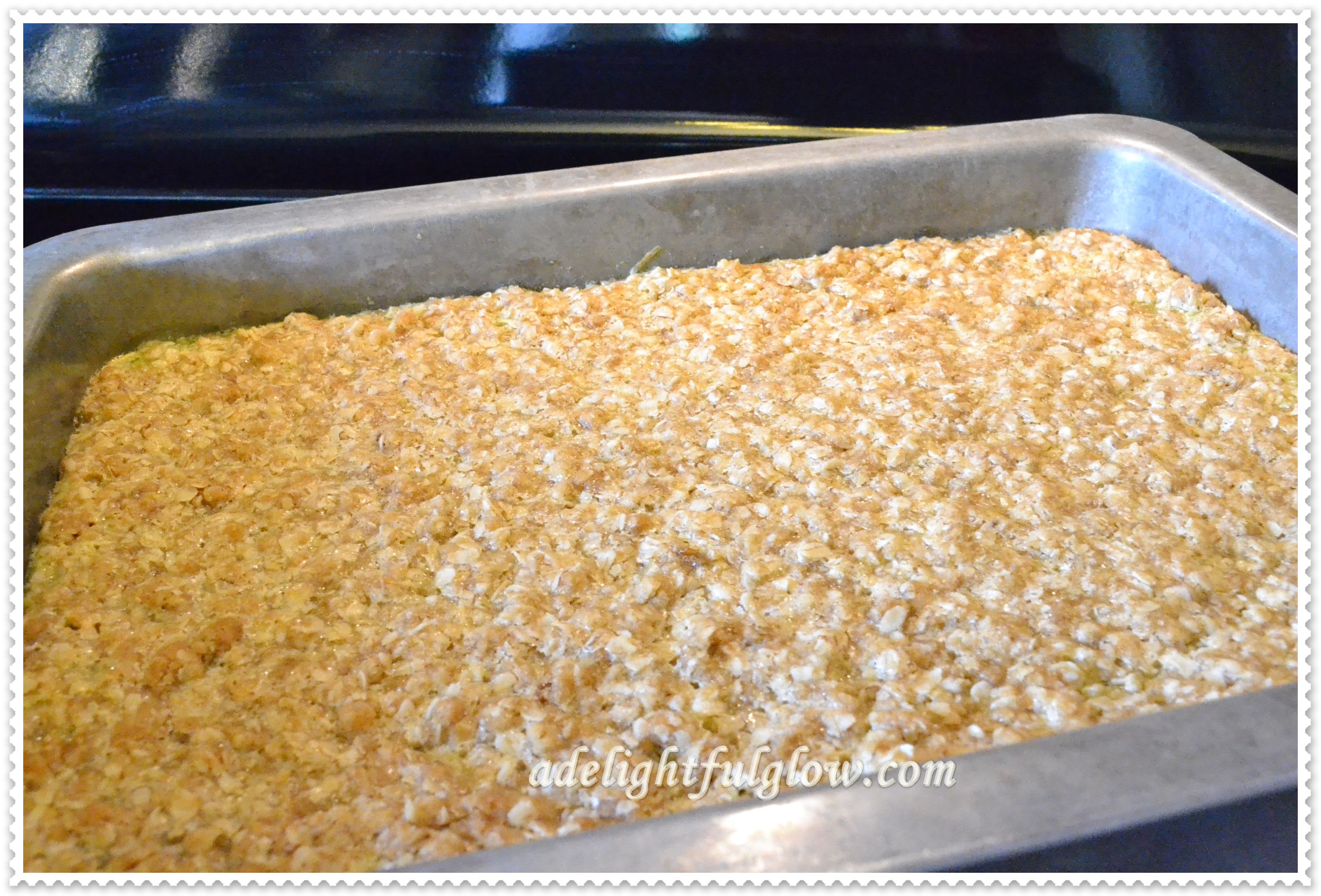 - Combine these ingredients and spread in a greased 9x13 baking dish.