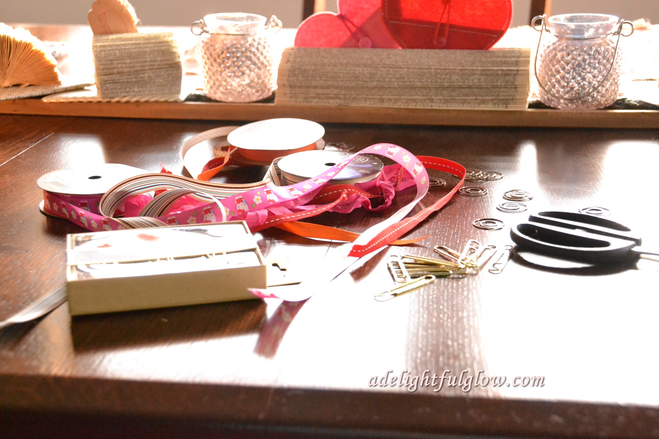 I gathered some spools of ribbons ans scraps of ribbon and scissors and the paperclips.