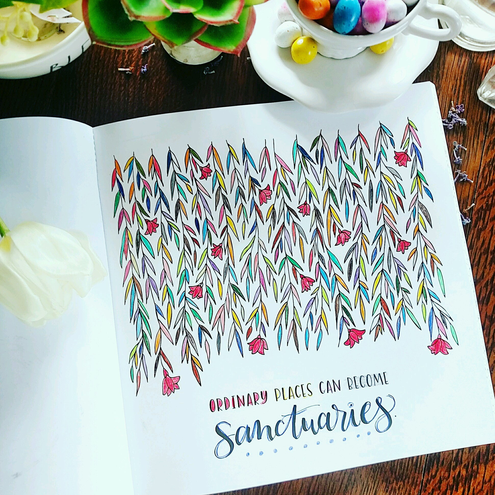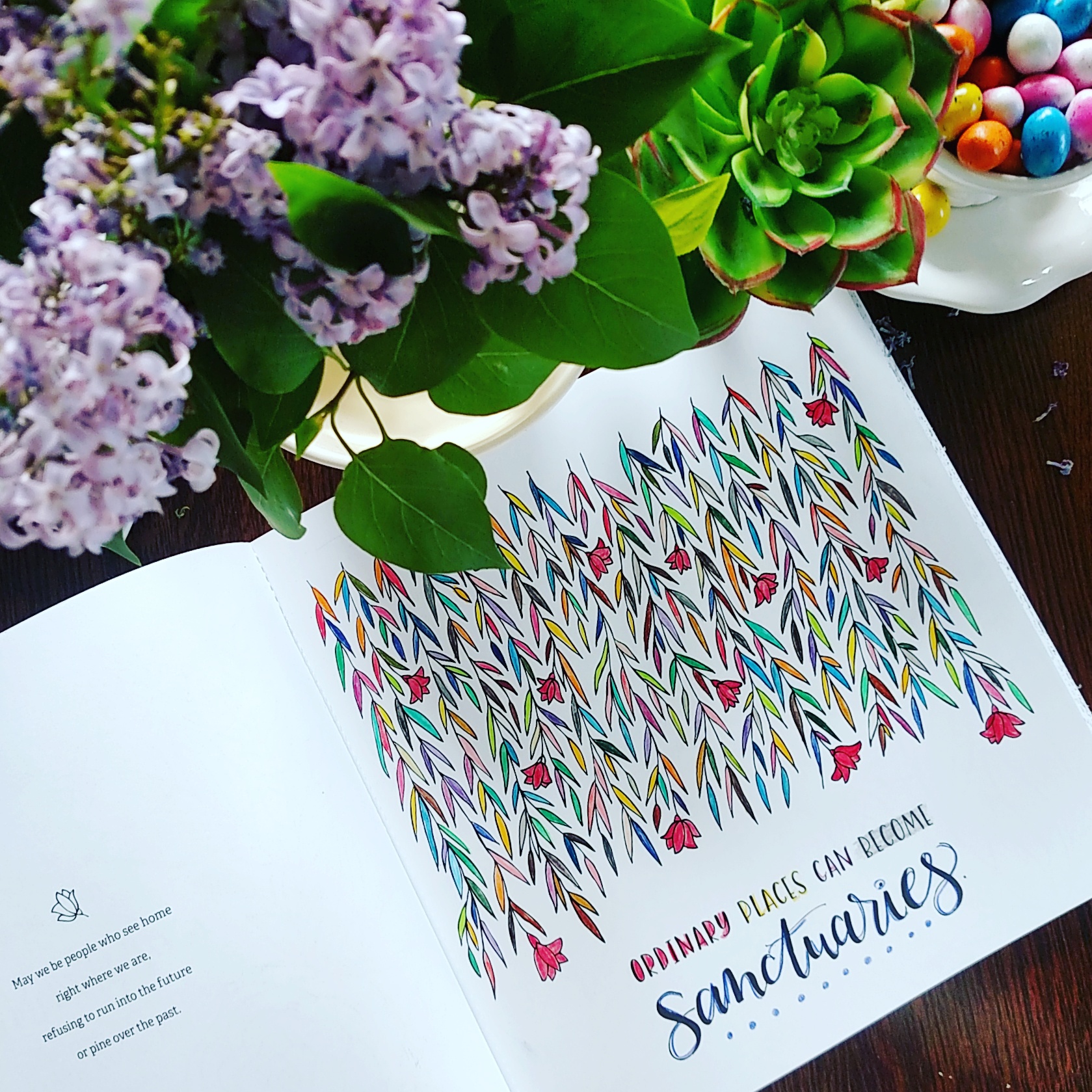 Hi! Praise God for you and what you have shared here. 🙂 Would you please tell me what the words say opposite the page you colored? I have used my magnifying glass, gone to the book page, only to find that page is not included in “look inside.” It’s okay. That’s just me. Today, I was just going through a bag of souvenirs from conferences and more. Wow! What time I had as I sat in my bed enjoying those memories. I suspect this is a bit of what you are sharing about sanctuary in the ordinary. Thank you for sharing. May God continue to bless you richly!