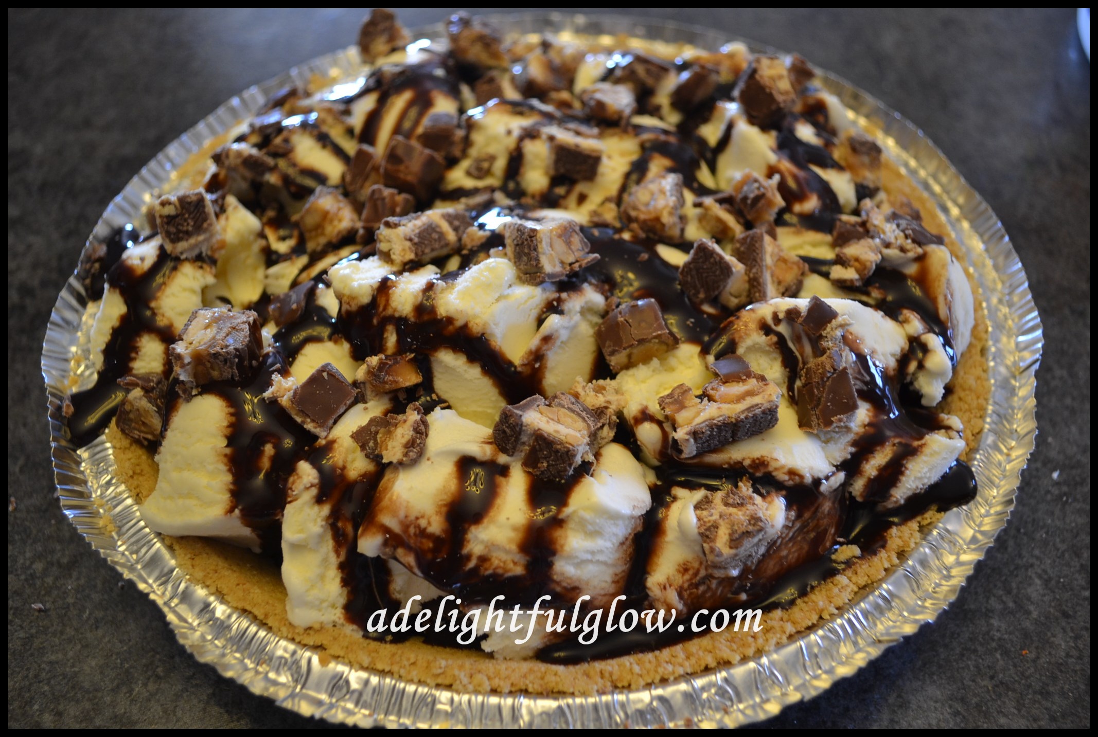 Ingredients Instructions Chop Snickers into small pieces. Dip a layer of vanilla ice cream into your graham cracker crust. Drizzle with chocolate syrup and caramel syrup if desired. Sprinkle with 1/3 of your chopped Snickers. Repeat layers. Spread Cool Whip on top and sprinkle remaining Snickers on top. Freeze. Serve and enjoy a frosty treat! Notes This is really a to-taste recipe! You can use whatever amount of syrup you want and any size of Snickers will work. Just chop up and add the amount you want. If you want a little candy or a lot~it all works!