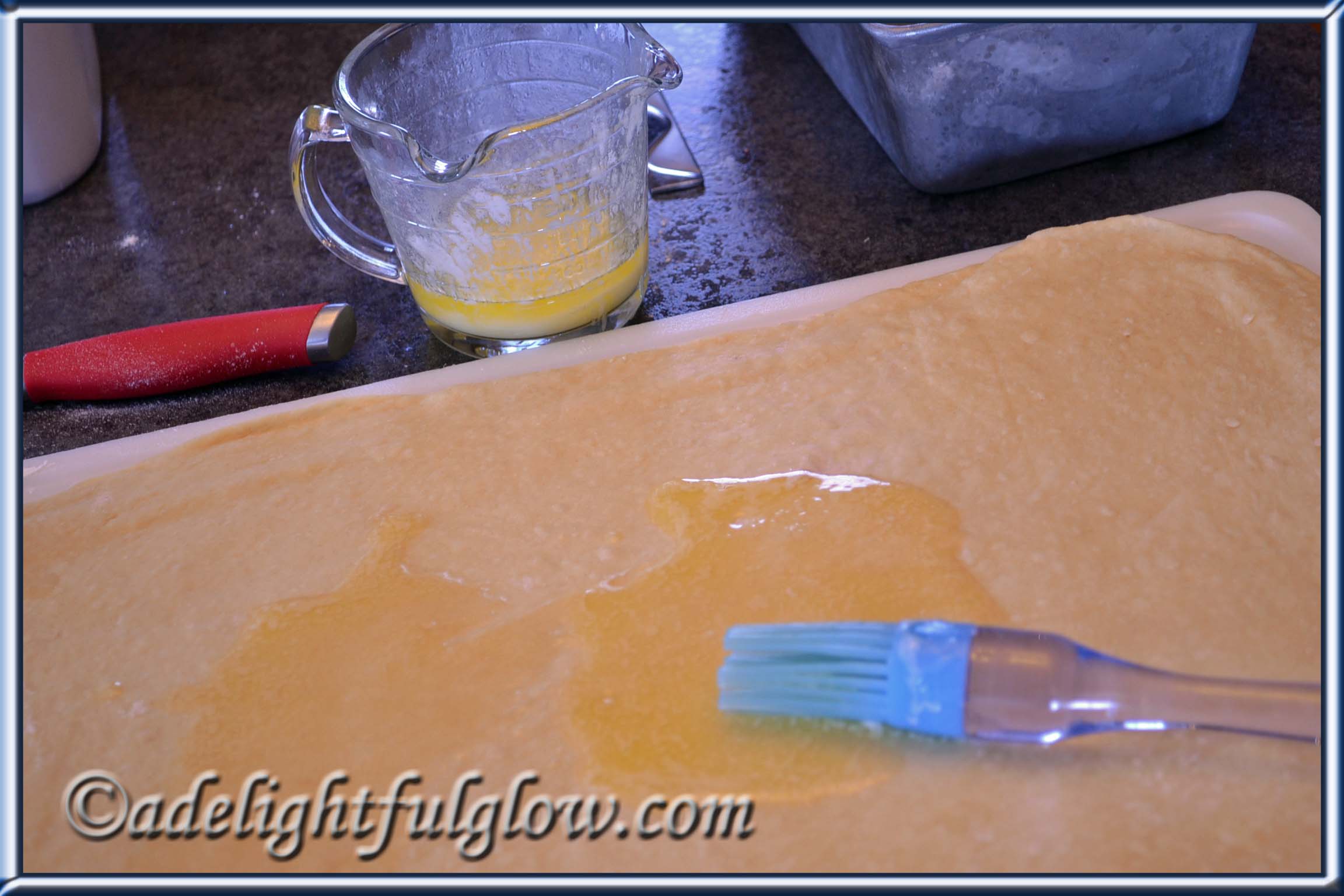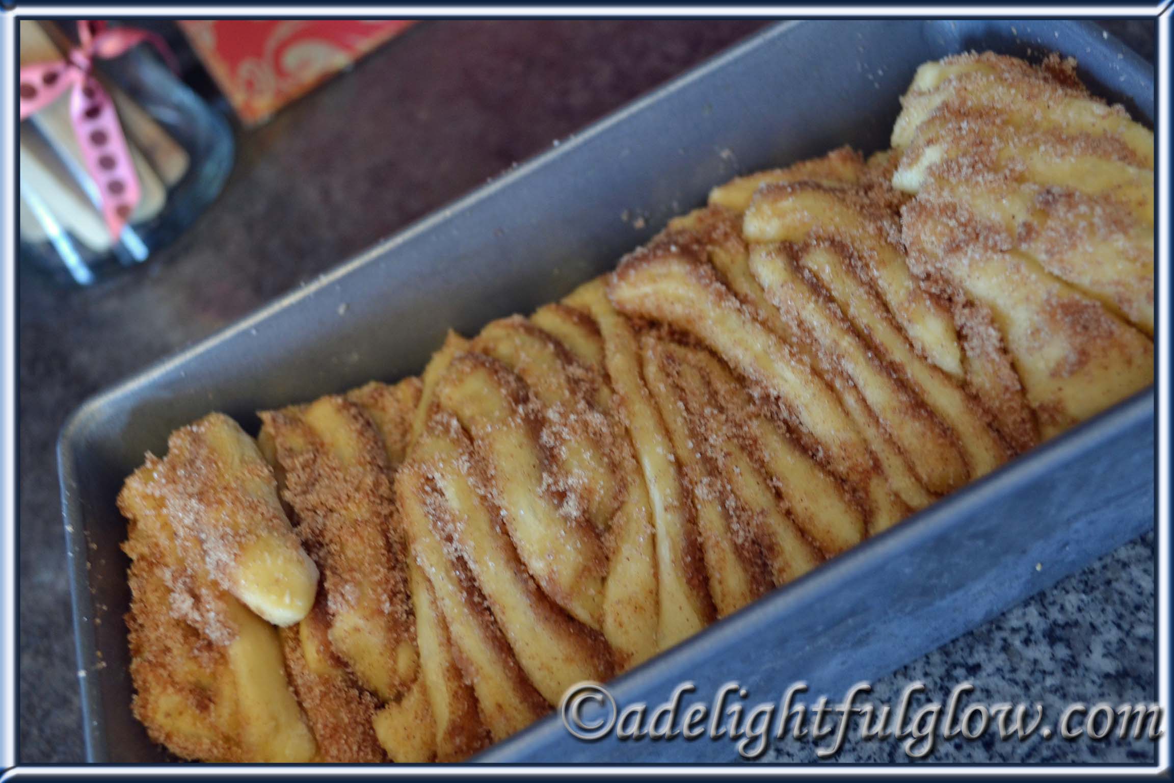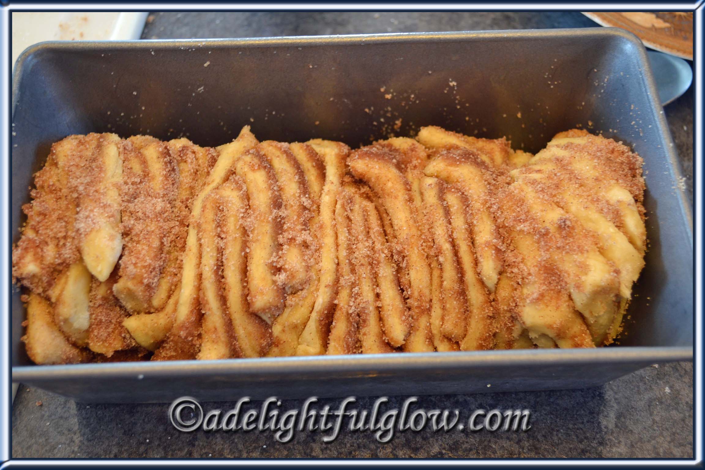 I like to work with yeast dough and I thought this recipe sounded fun with its unique way of cutting the dough and stacking it in your pan to raise.
