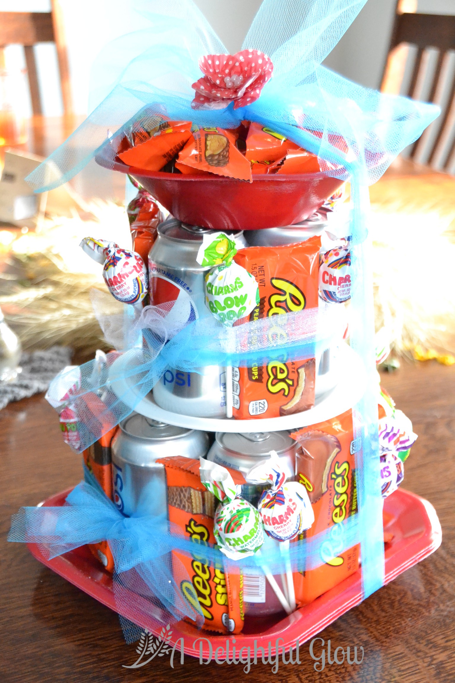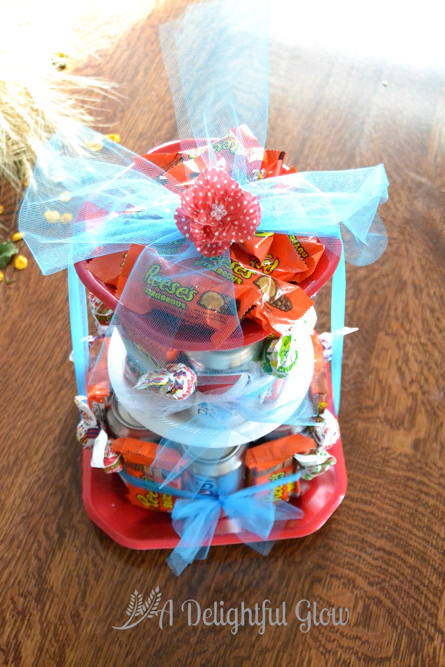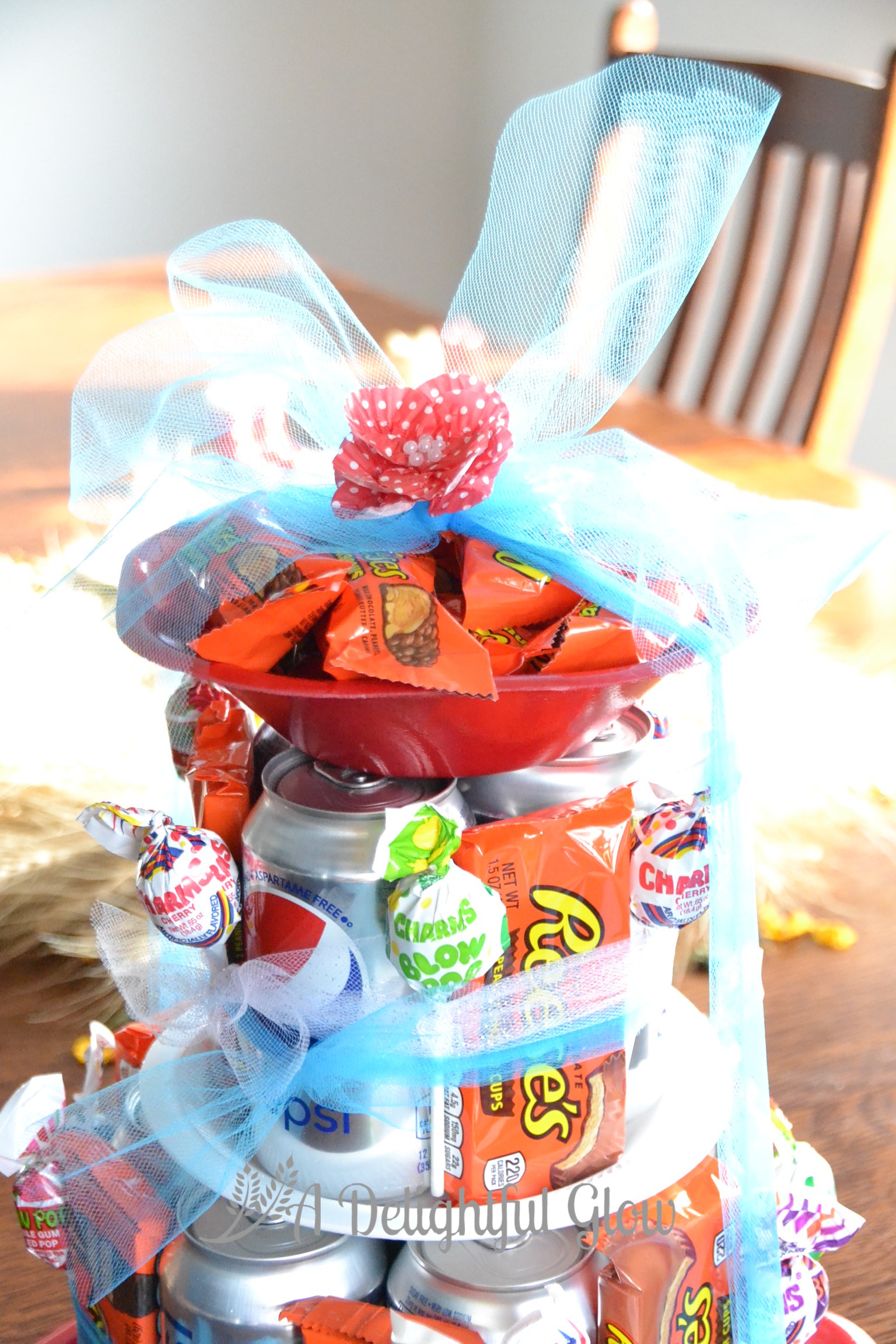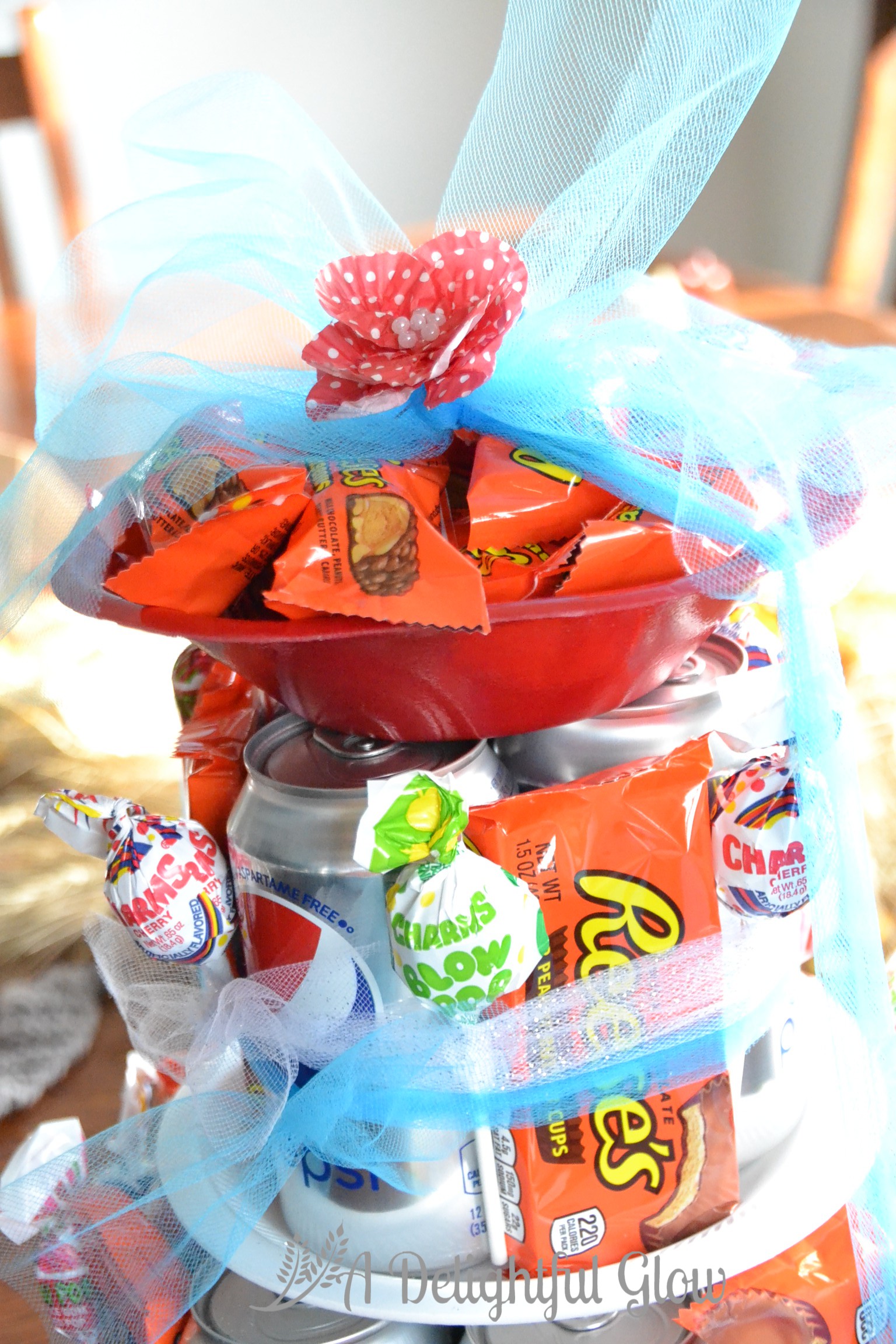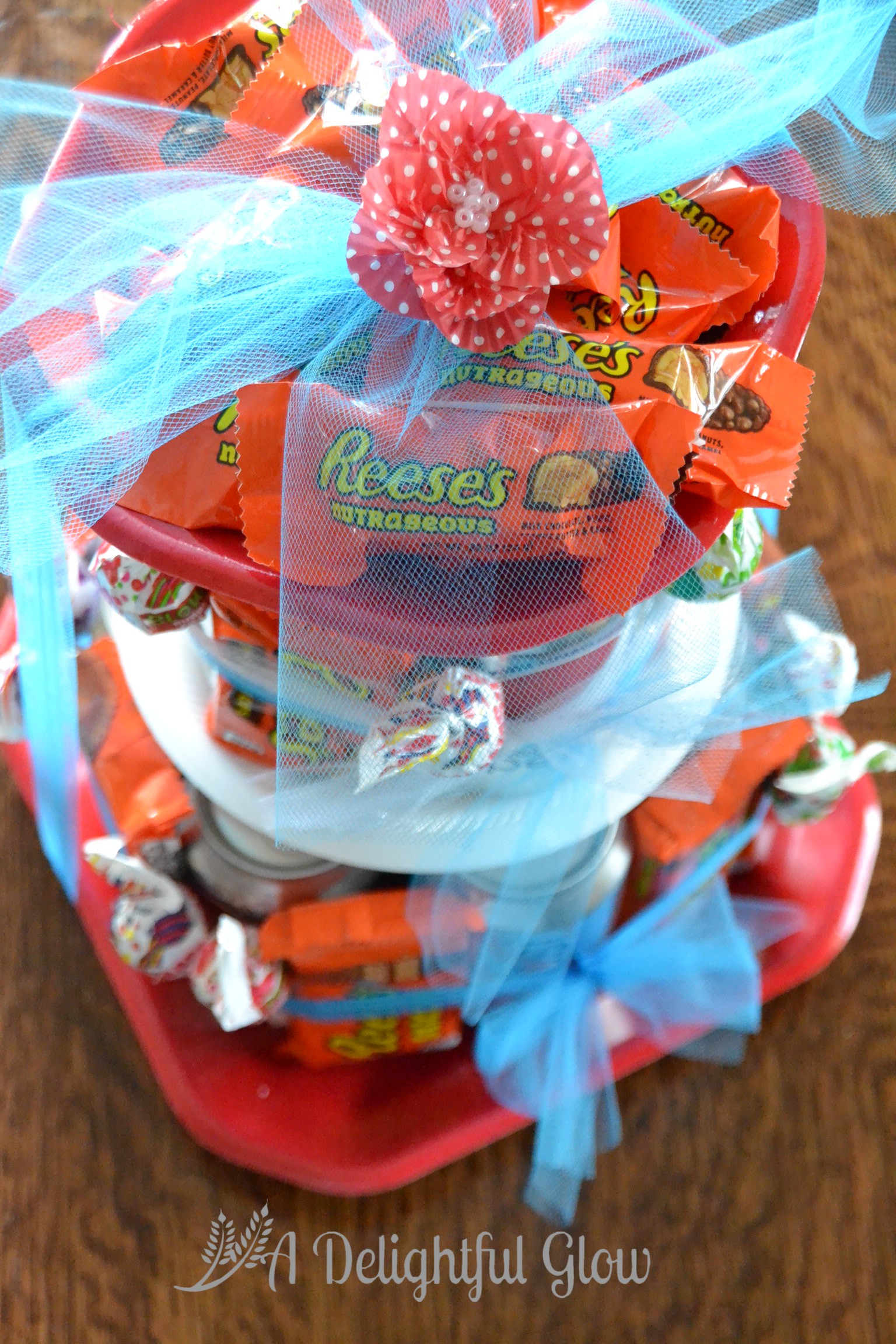 I set my pop cans up for the bottom layer and added in the Reese cups. I took my tulle and wrapped it snugly around candy and pop, tying it up in a neat bow. Then I tucked in the lollipops.