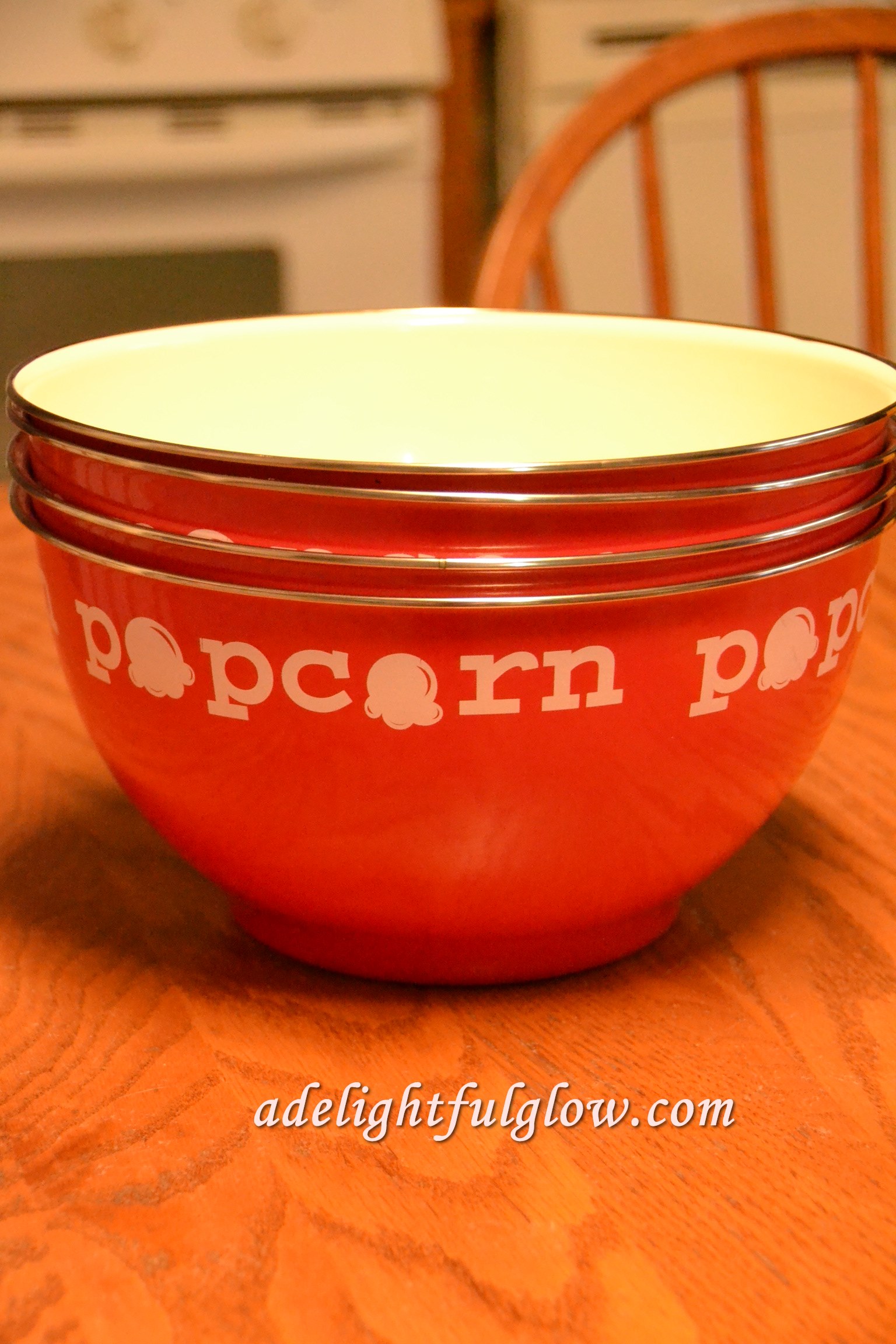 I found some plastic popcorn tubs at Target a few years ago. We have used them a lot and they worked well, but a couple have cracked and broken. These bowls are metal or a sort of enamel and they are just a favorite right now!