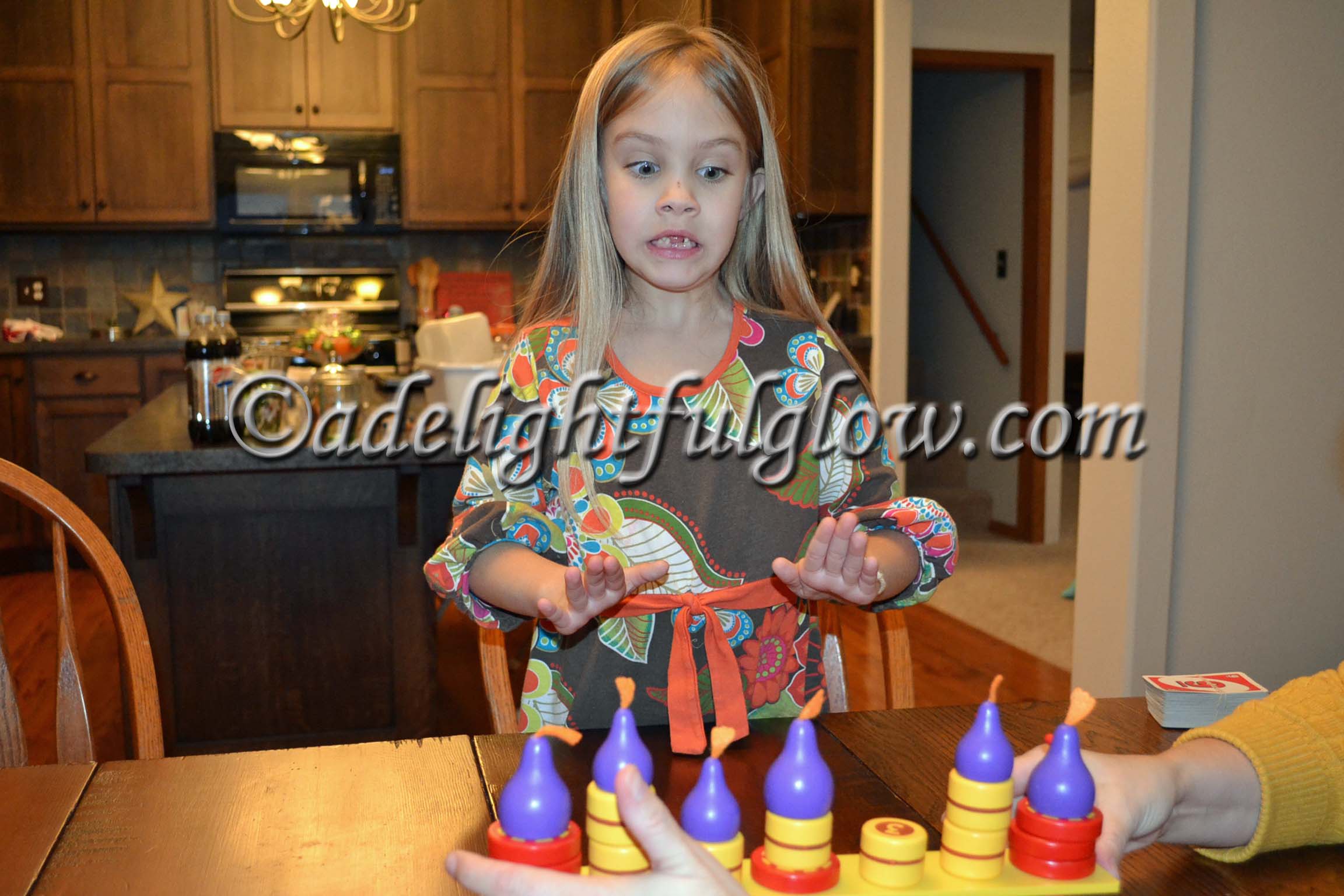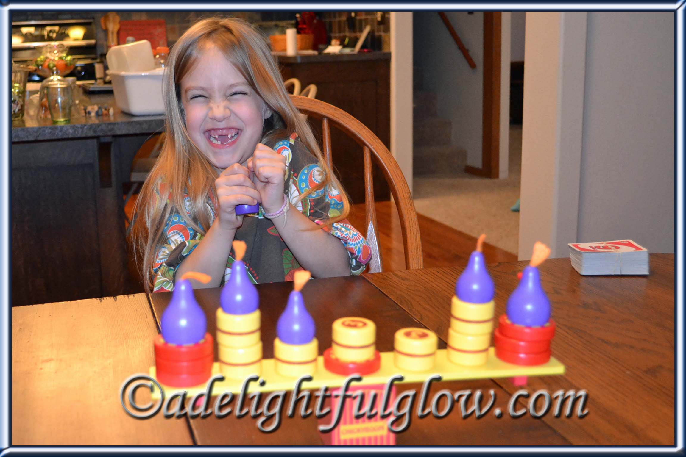 I have some really fun photos of my youngest niece when she was here at Christmastime. We played some games one evening and we played Chicky-Boom. It was new to her and she loved it. You just never know when the chickens are going to go boom. It adds a mysterious anticipation!