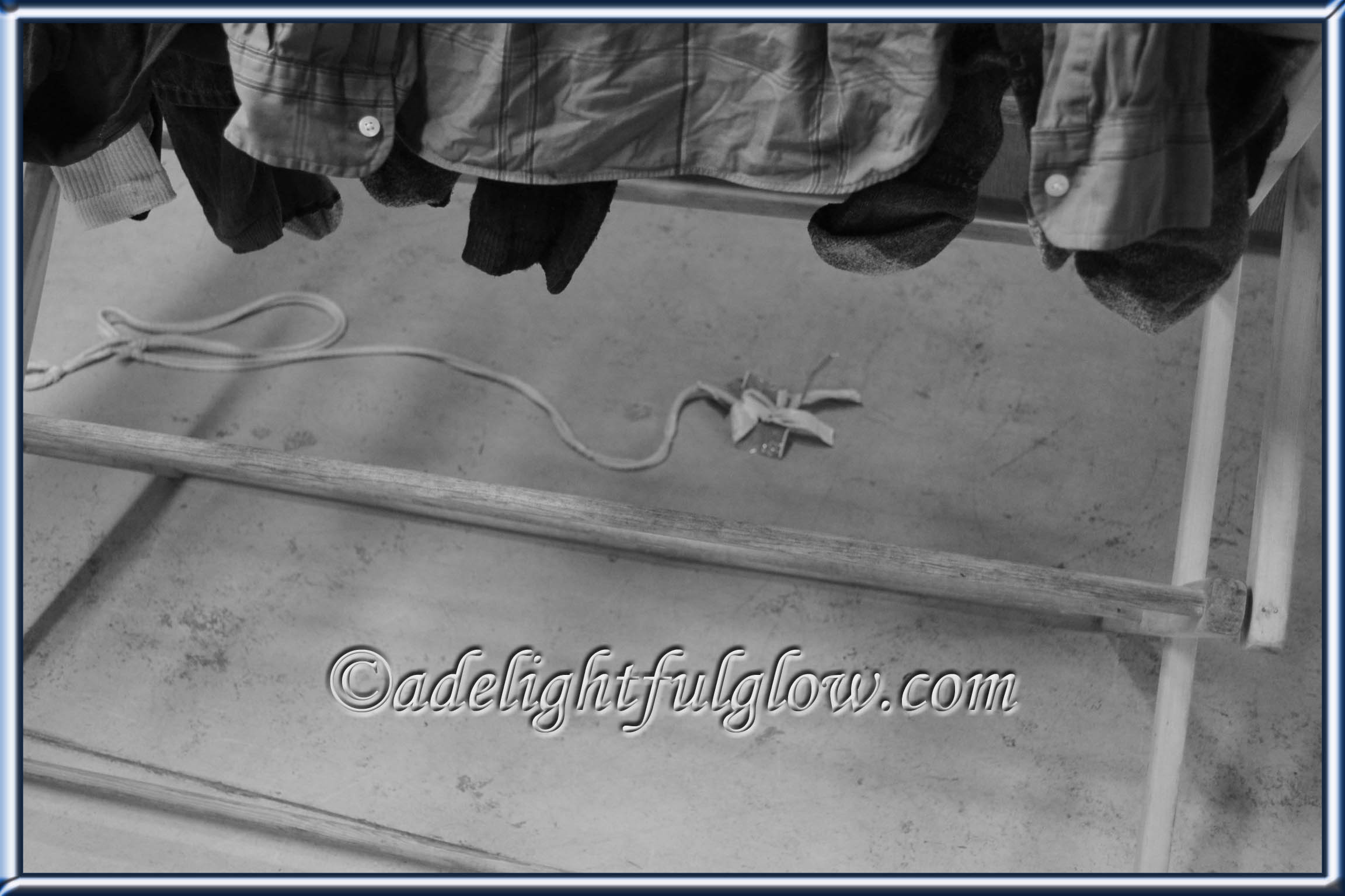 the bottom rungs of the drying rack, empty, no clothes hung there to dry, and pieces of string and material strung across the floor…
