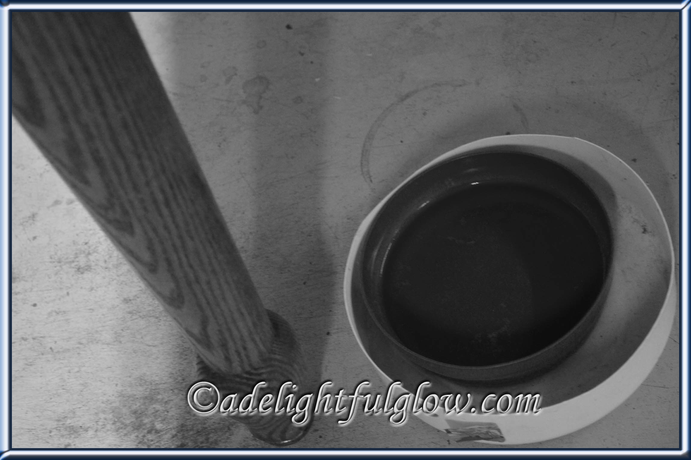 a bowl of water by the table leg and a messy basement floor…