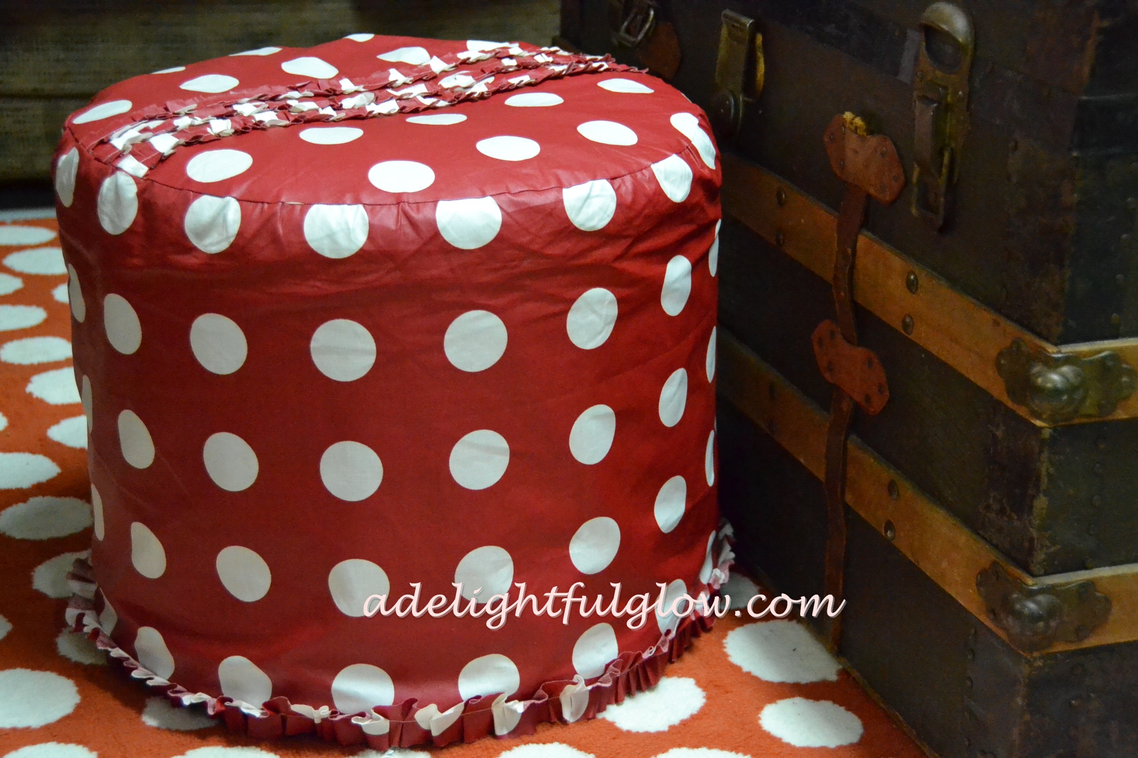 My No. 1 favorite find for this post is this red, polka-dotty ottoman that was welcomed to our basement. I’m loving it. Stools, ottomans, footrests…they’re just great to have to pair with couches and chairs, plus they can make a nice perch now and then and add a fun bit of decor to a room.