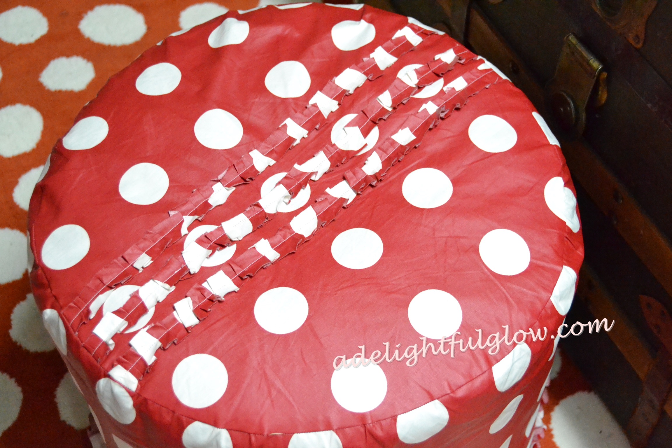 My No. 1 favorite find for this post is this red, polka-dotty ottoman that was welcomed to our basement. I’m loving it. Stools, ottomans, footrests…they’re just great to have to pair with couches and chairs, plus they can make a nice perch now and then and add a fun bit of decor to a room.