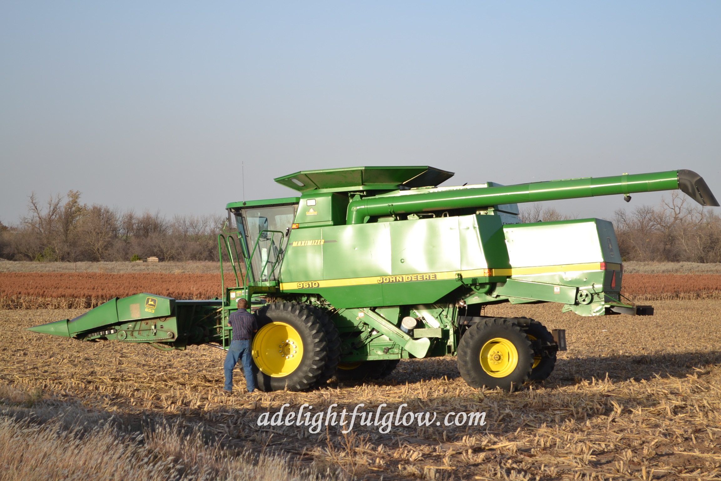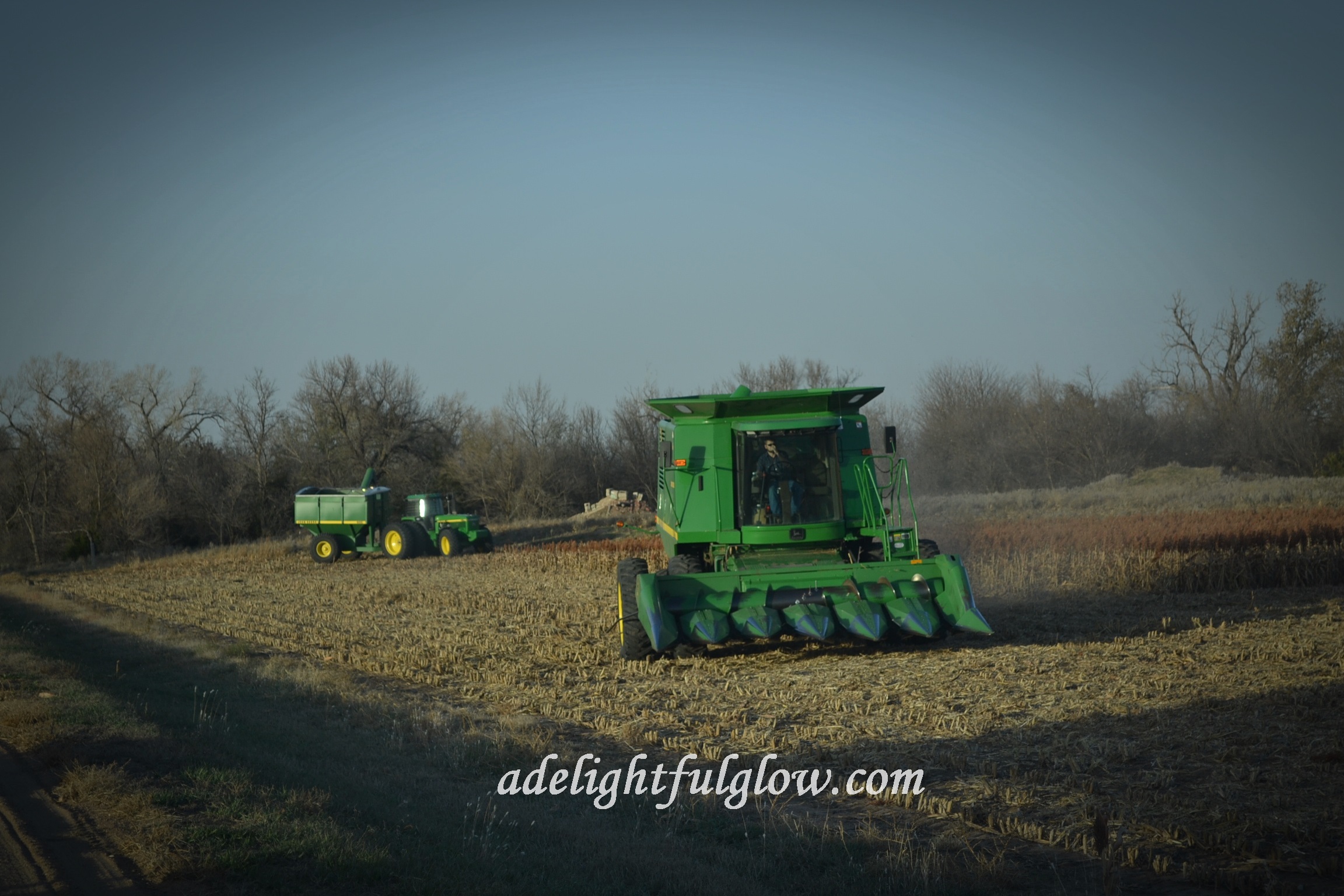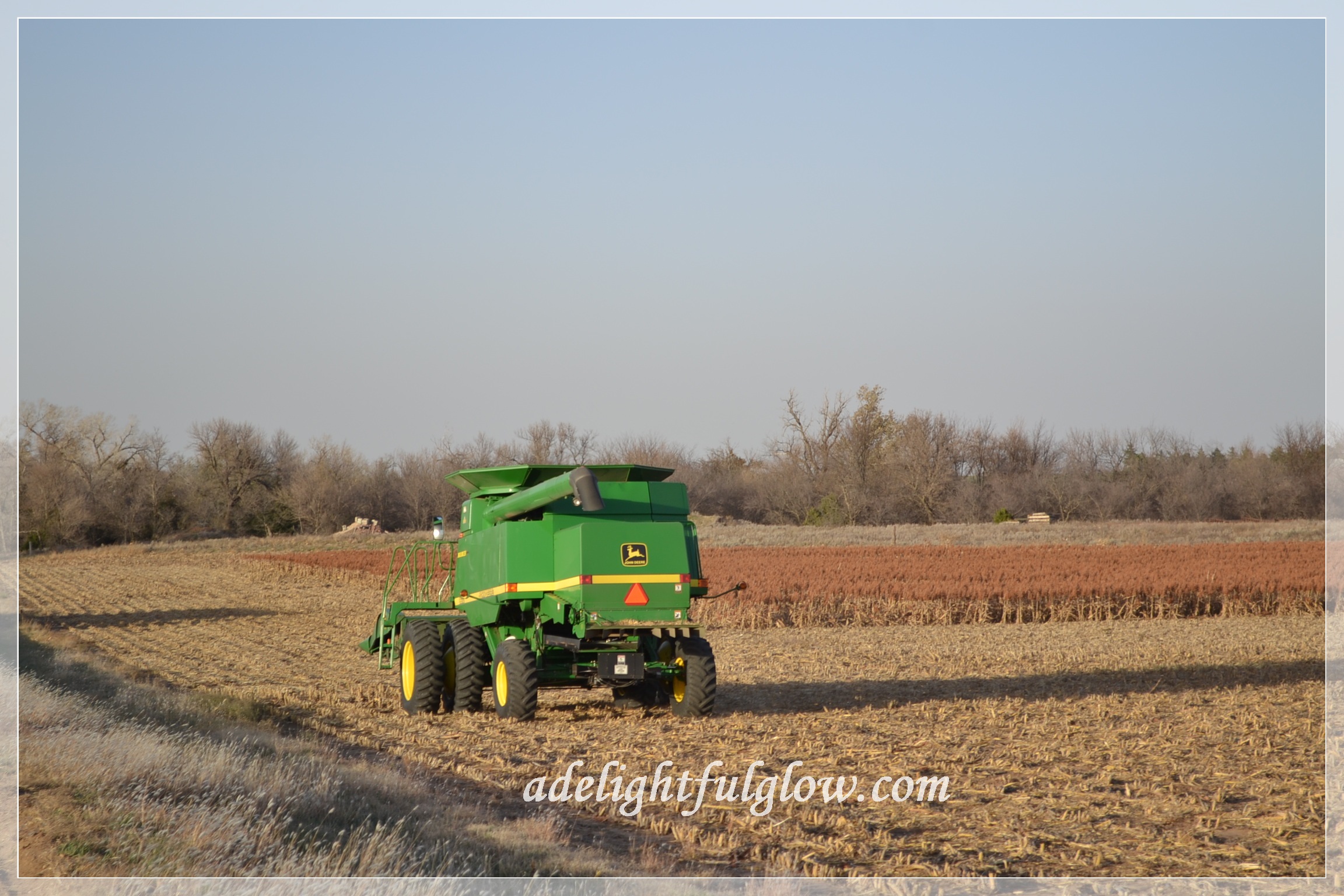 We started cutting milo the end of last week. Today my farmer man is racing against the weather. We were waiting for the moisture to go down in the grain, so we could cut. Now we’re hoping to get the most of it cut before the weather changes. We’re supposed to get rain tonight, with the forecast for the next couple of days including wintry mix and snow/sleet and a high of 29 degrees on Friday. BRRRR. The end of November is edging up on us, though, so I suppose we can’t escape the cold completely.