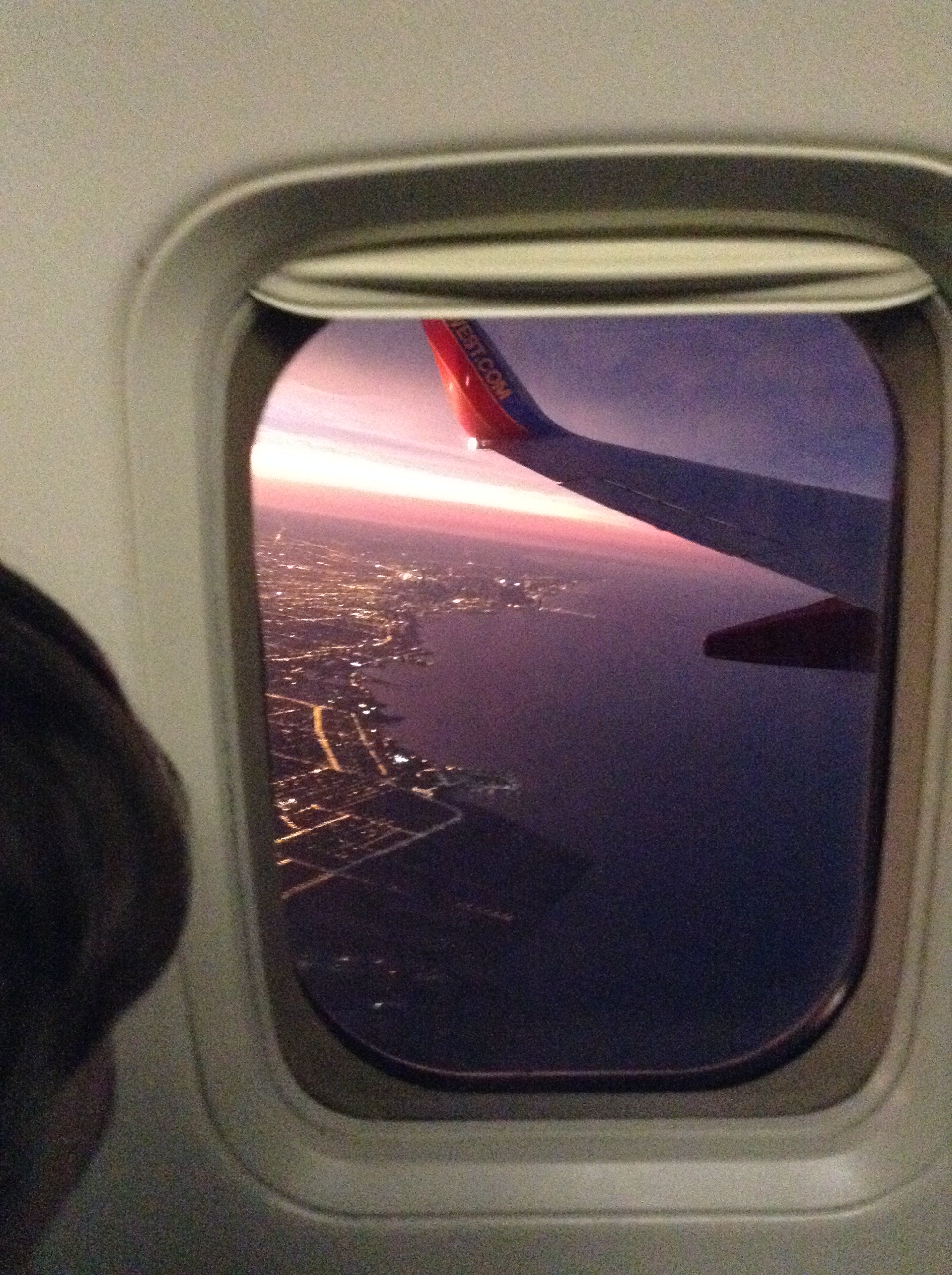 We also got to fly at night, another new experience for both kiddos. It was getting dark as we winged away from Chicago and flew over the lake and city. All the lights were really pretty and Renae was fascinated to get a close up view of the blinking light on the wing of our plane. A whole different viewpoint than standing on the ground, gazing at the blinking light on a plane in the sky!