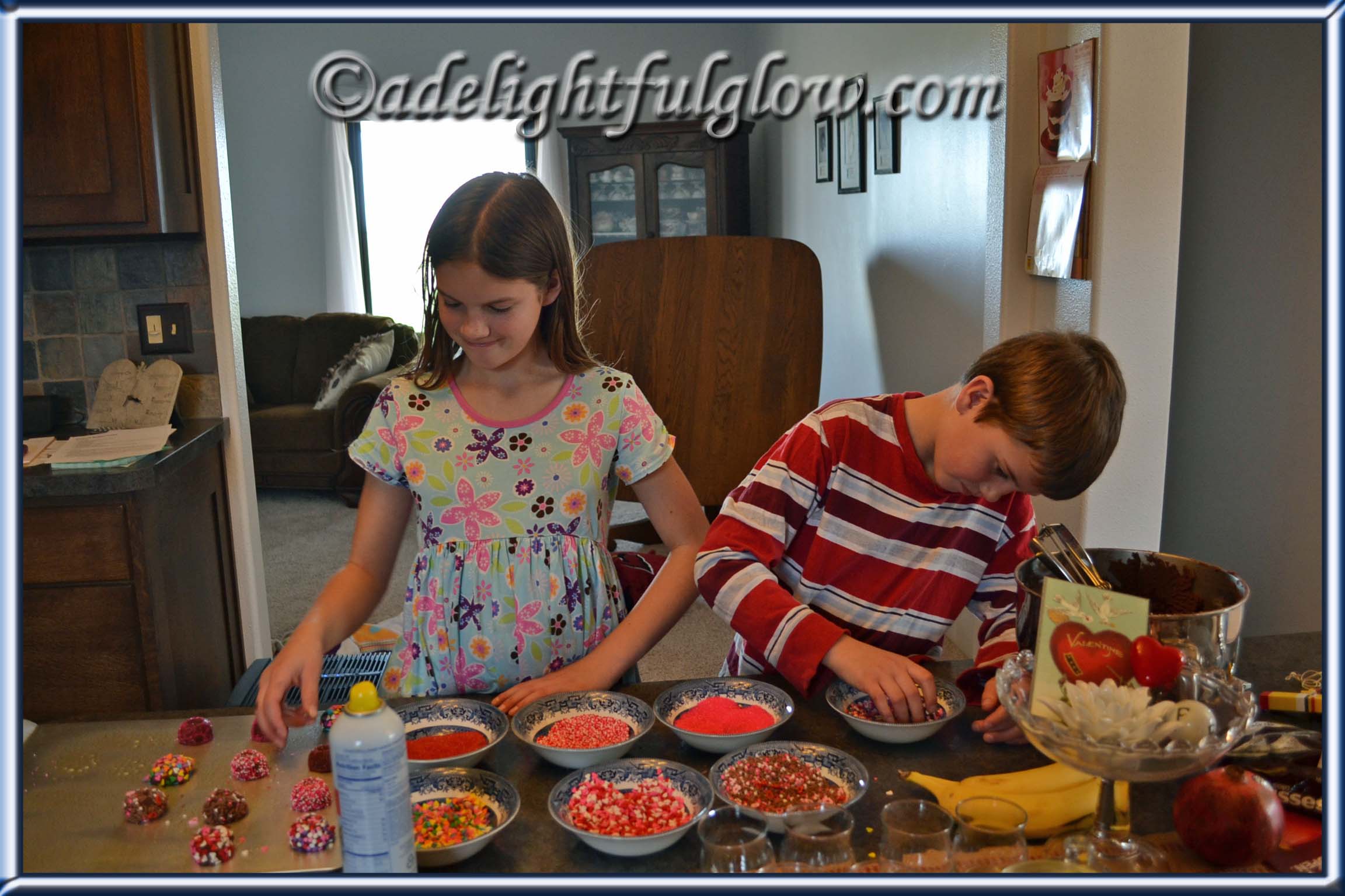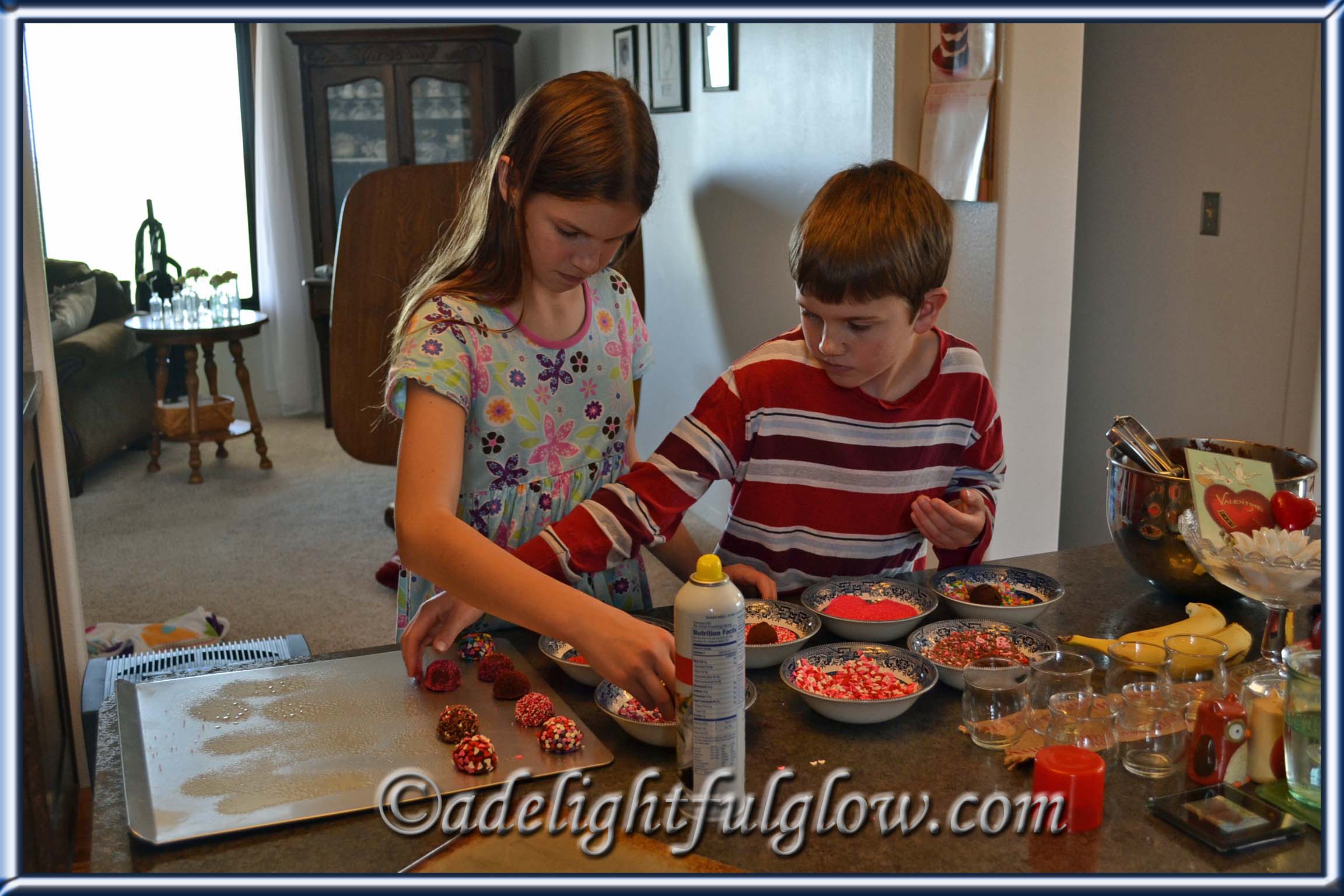 I’m trying to figure out what is in the living room behind R and T in the pic of them rolling cookies in sprinkles.