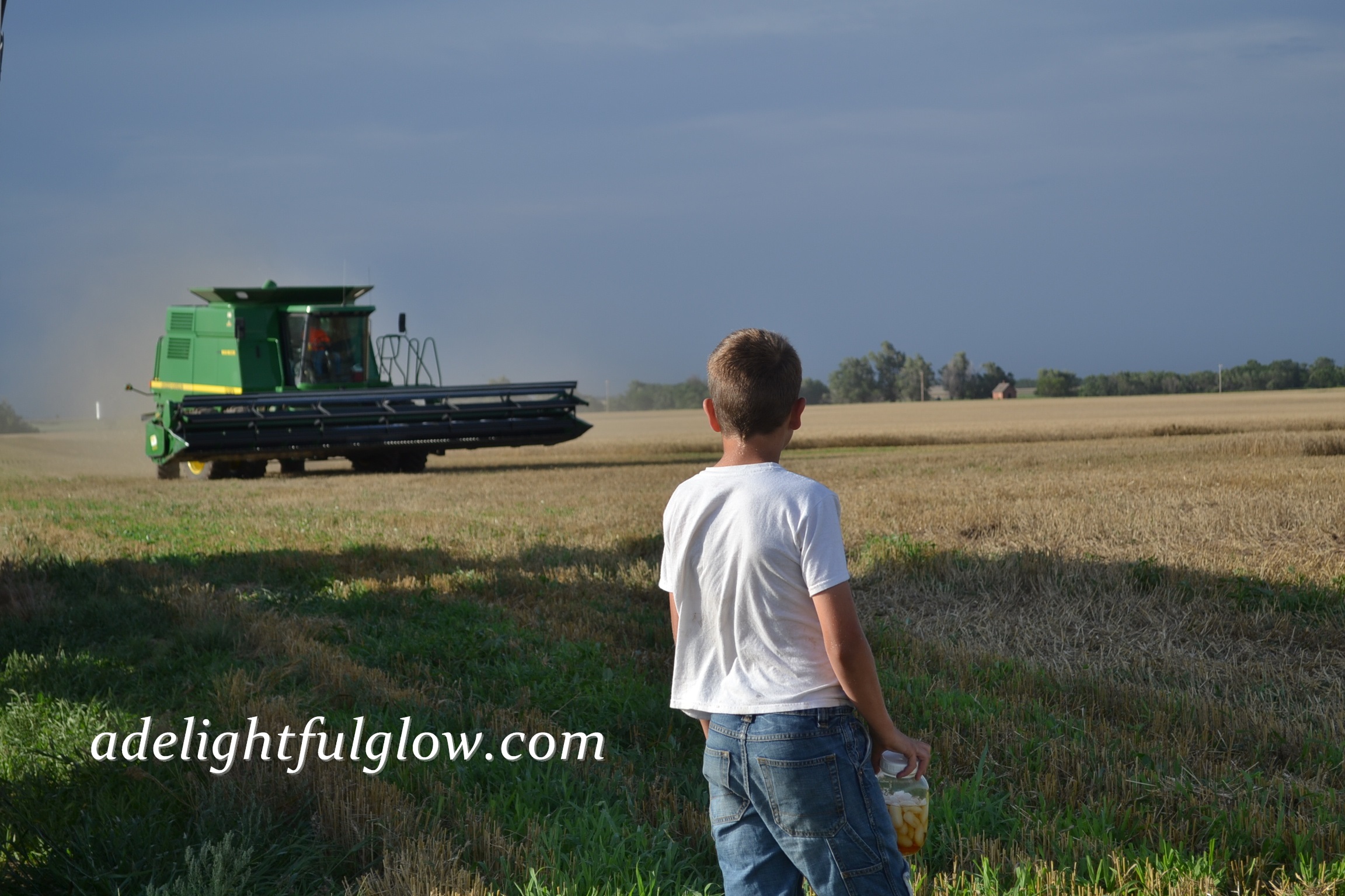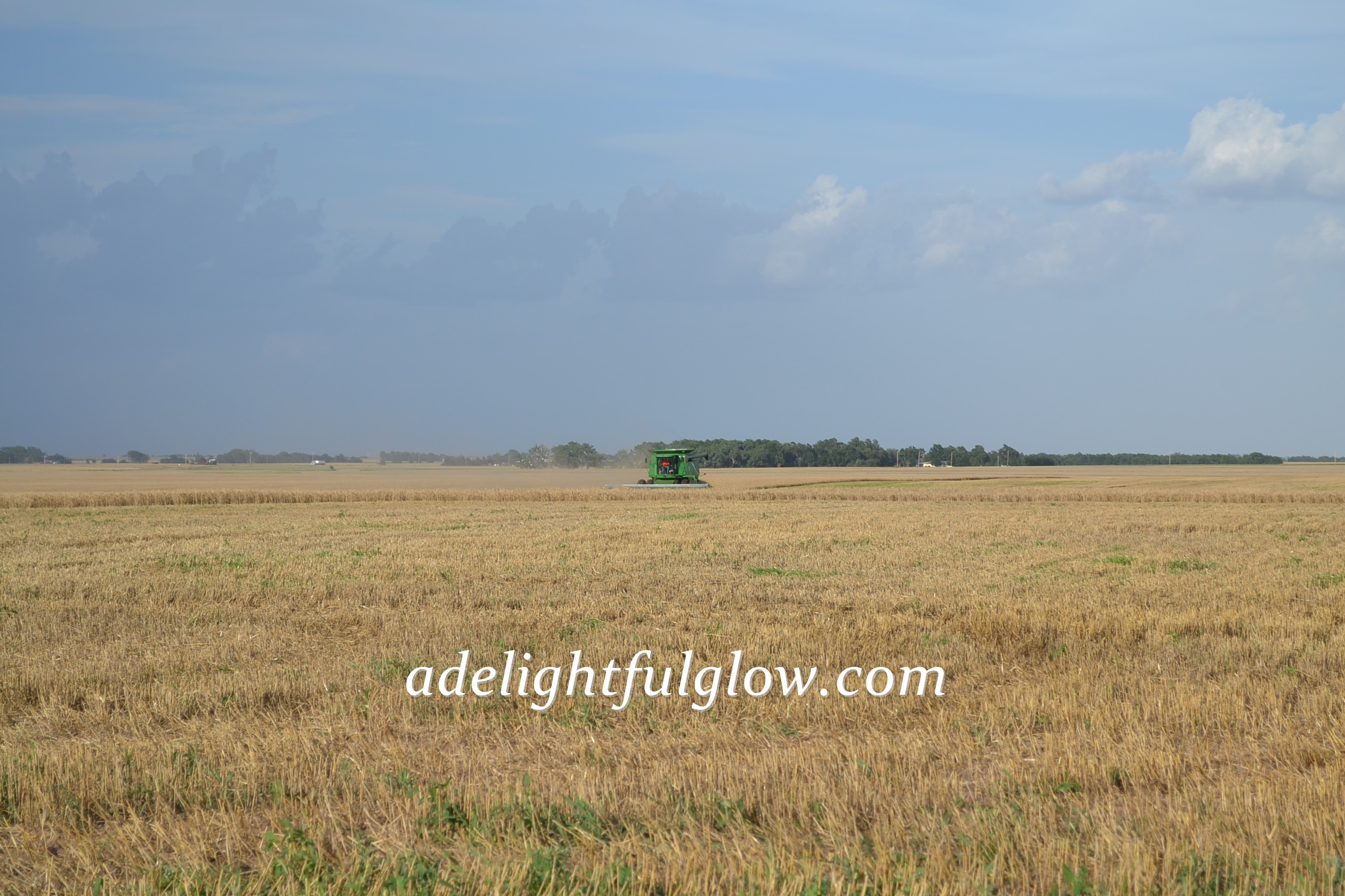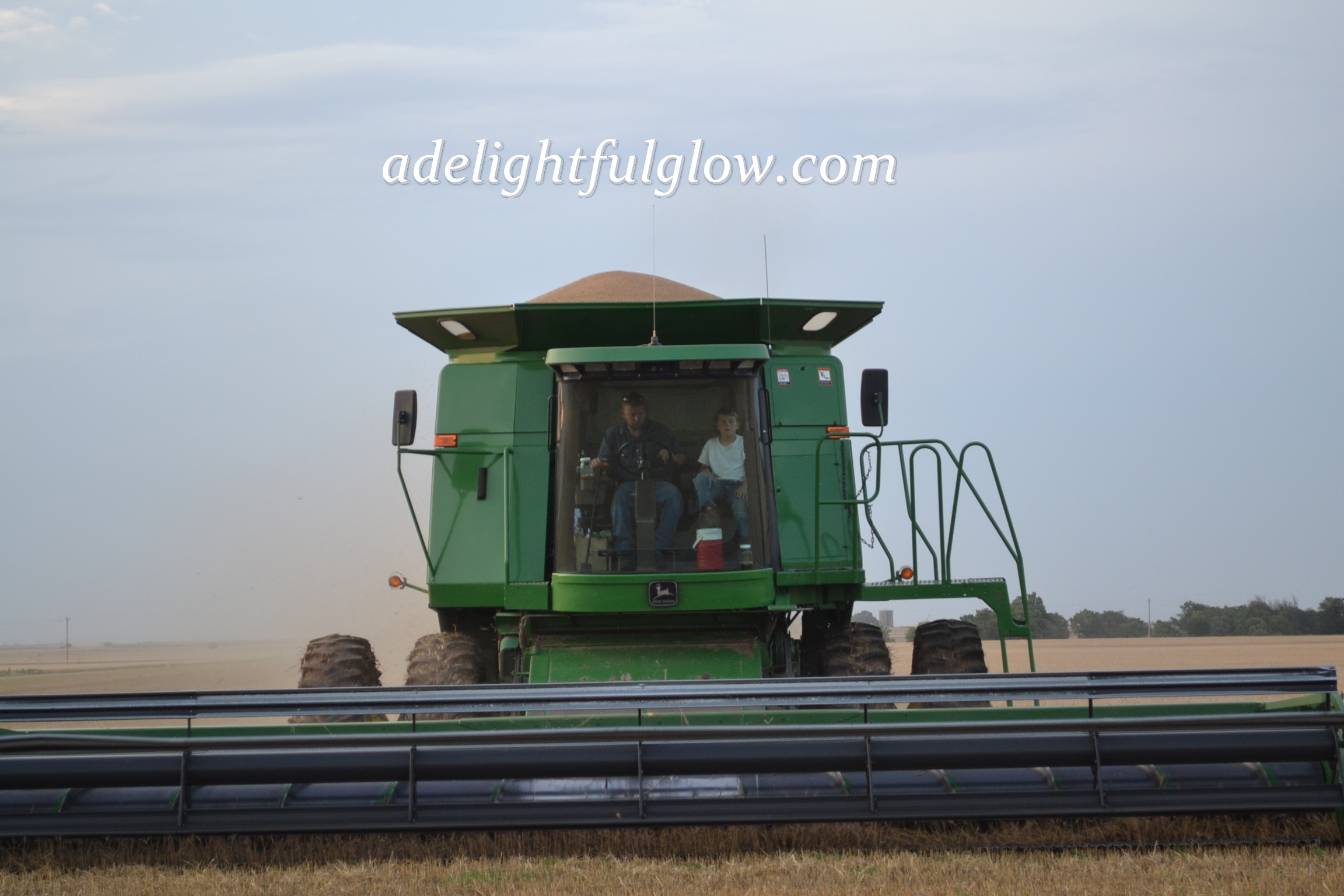 My husband started farming eighteen years ago. He cut his first milo crop in the fall of 1996, married me in May of 1997, and cut his first wheat crop in June of 1997. {I can’t say for sure which of the three events he enjoyed the most, but I’m leaning strongly towards wheat harvest.} 😉 1997 yielded a very good wheat harvest. We cut some 70 bushel wheat and haven’t done that since. The elevators filled up and the line of trucks waiting to dump their wheat backed up onto the edge of the highway. My new husband borrowed a semi and trailer from a neighbor so he could keep cutting away with his John Deere 95 combine. His Grandpa was hauling wheat for us in the dump truck, but was stuck in line, waiting, at the elevator. Every bit of this was pretty new to me. I knew a few farm basics and visited once during wheat harvest, when we were dating.