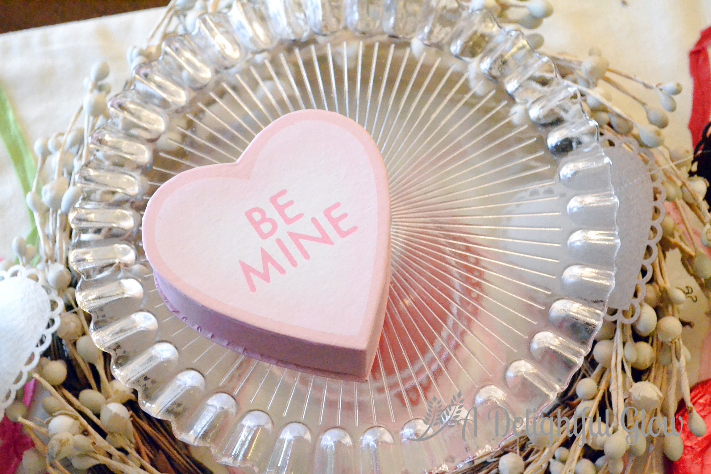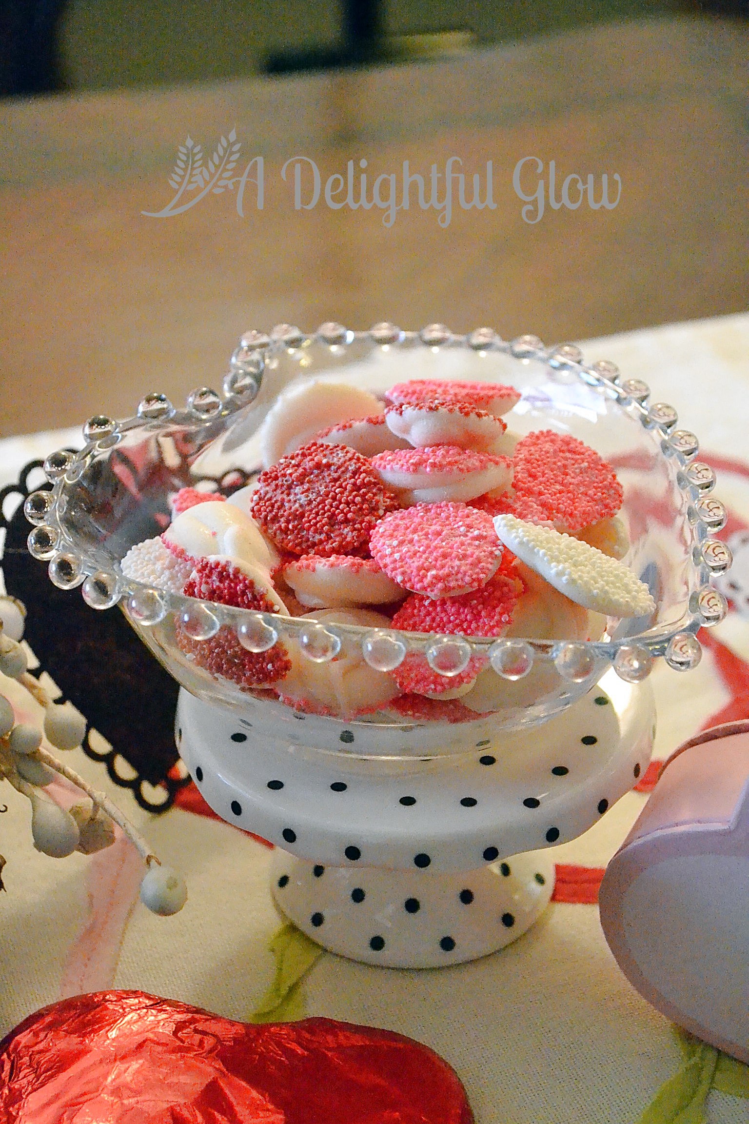 The Mint Jewels are still proudly gracing my coffee table and looking so Valentine-y with my pink and red ribbon roses runner.