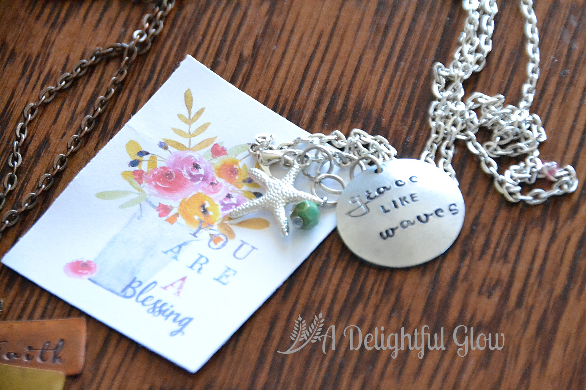 I love my grace like waves necklace! {last summer, we did a giveaway for one of these necklaces and a Grace like Waves pillow from SAFS.} It’s long over, but you can go look at the pictures and you can order a Grace Like Waves pillow from Sew a Fine Seam.
