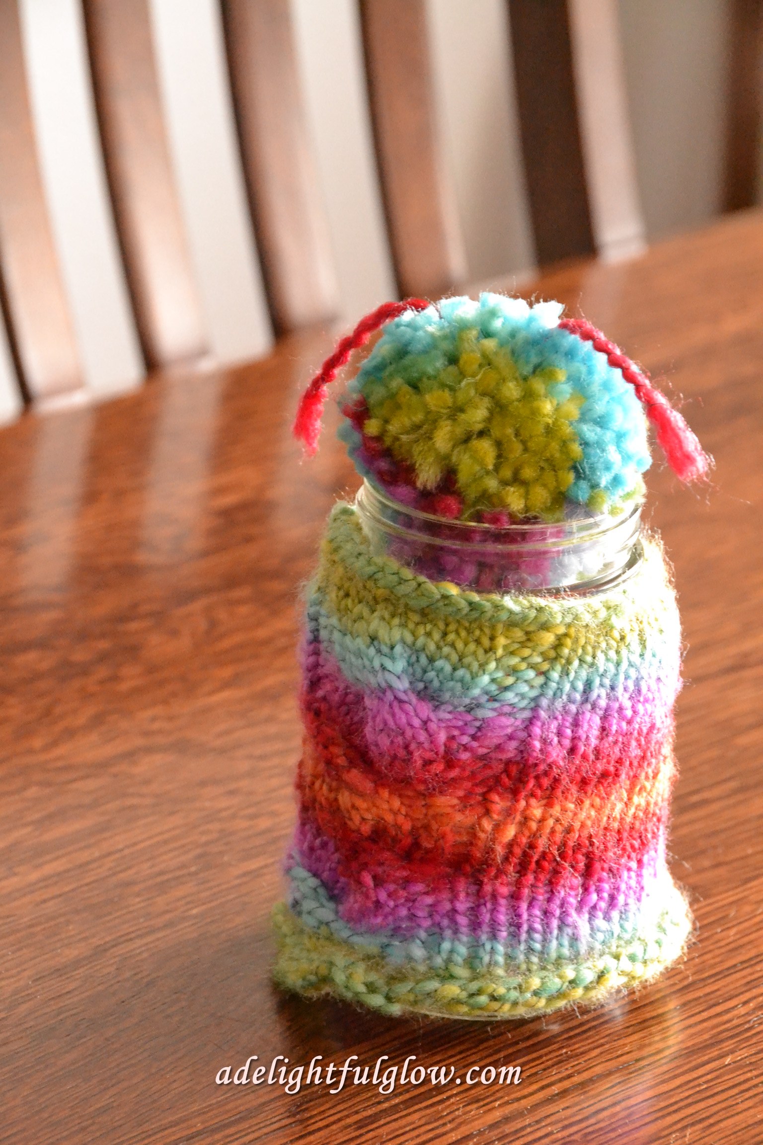 I made a pom-pom out of the bright yarn. I stuck it on top of the jar and when I saw it sitting jauntily there, I dubbed it a doodlebug! Ha!