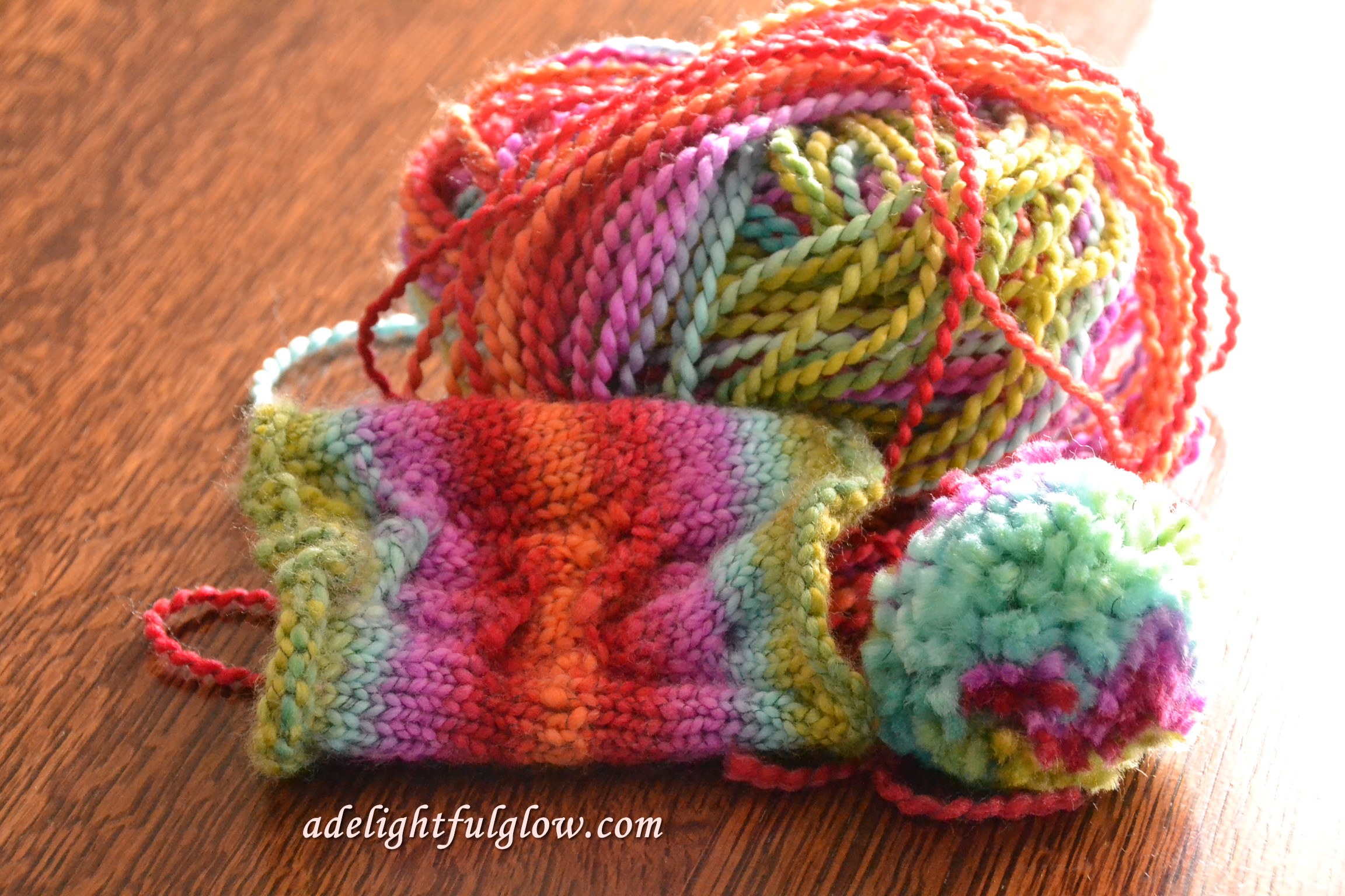 I finished the cozy! Love the colors. The cable pattern didn’t turn out, just as I was suspecting. Therefore I named it the Crazy Cable Cozy. Towards the end, I *think* I realized I may not have been adding the stitches back on the needle in the right way. I also had several times when I ended up with too many stitches and then not enough, so all in all, it was just somewhat a mess! While I really like the look of this yarn, it wasn’t the easiest knit. It has some fluff to it and was really easy to catch it or for a needle to slip into the middle of a stitch.