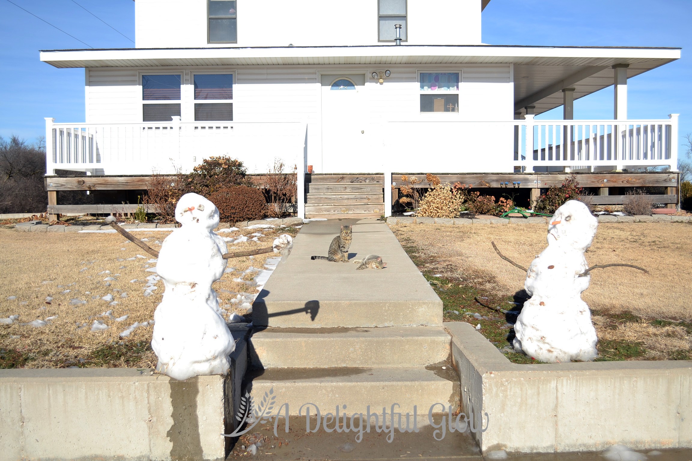 My kiddos went out and made this pair of snowmen. They look like they are guarding the end of my walk for me!!