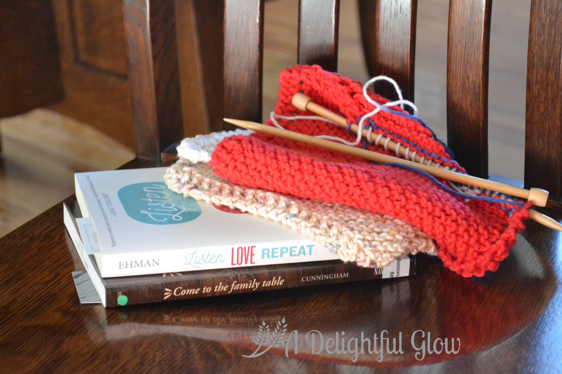 Oh, and knitting! Those are my dishcloths for the week. I ran out of red yarn and I’m finishing with an odd scrap that doesn’t match at all. It will be a dishcloth for me to use instead of giving it away! 🙂