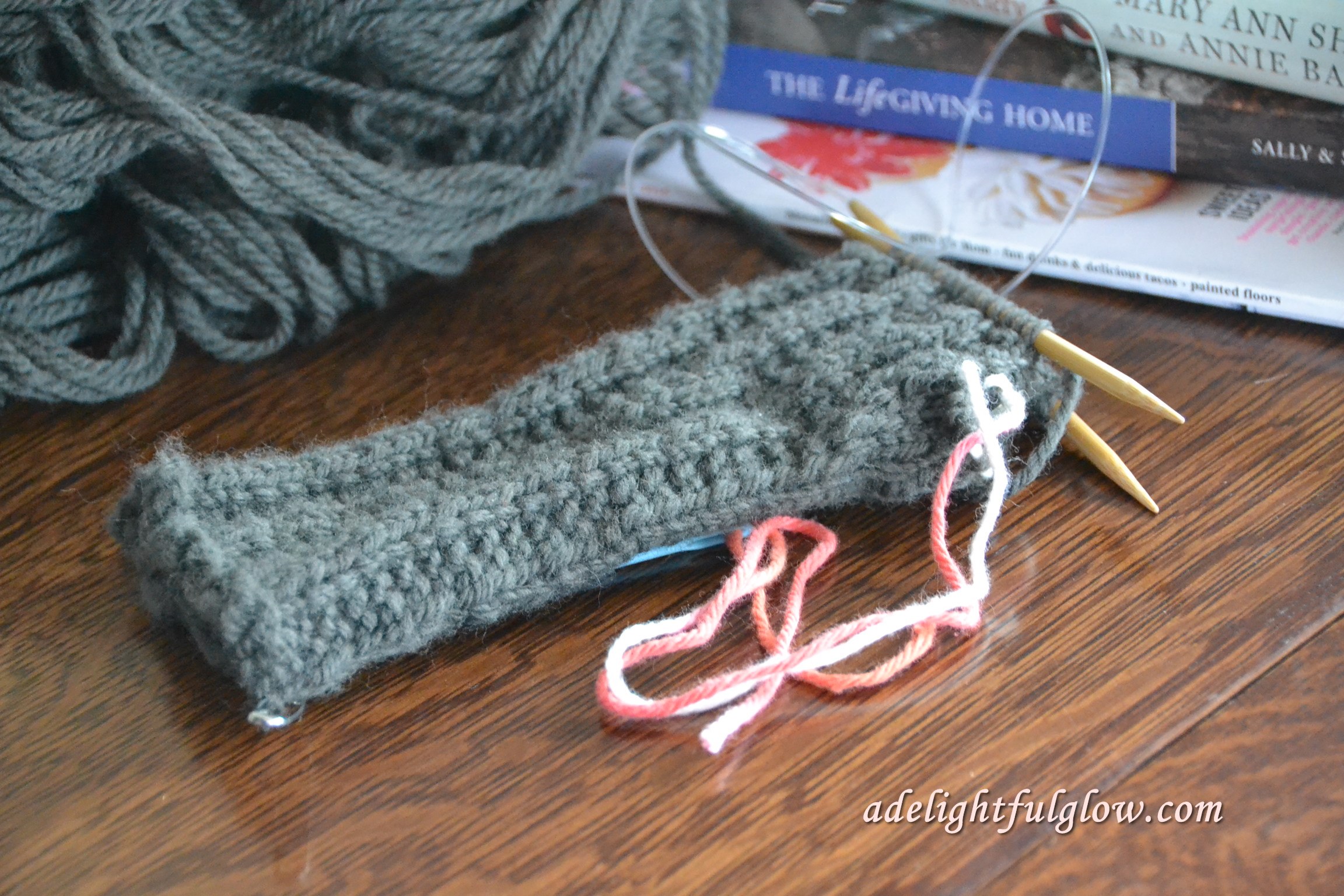 Now I’m back to the same stitch pattern for the rounds like I was following at the beginning of the pattern, so it’s easier again. Knit one, pearl two, knit two…………..