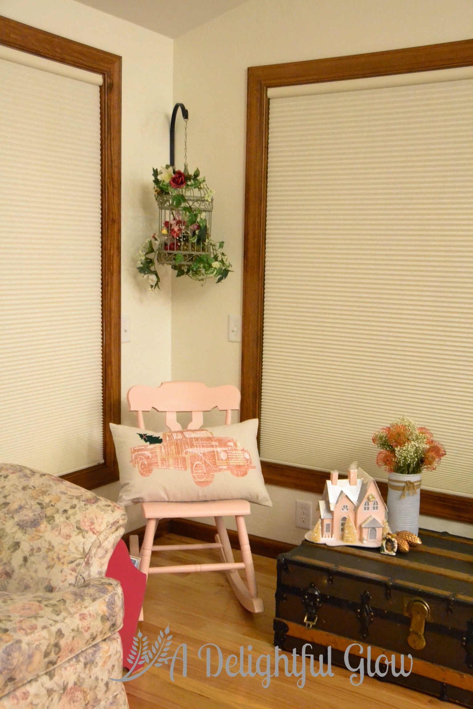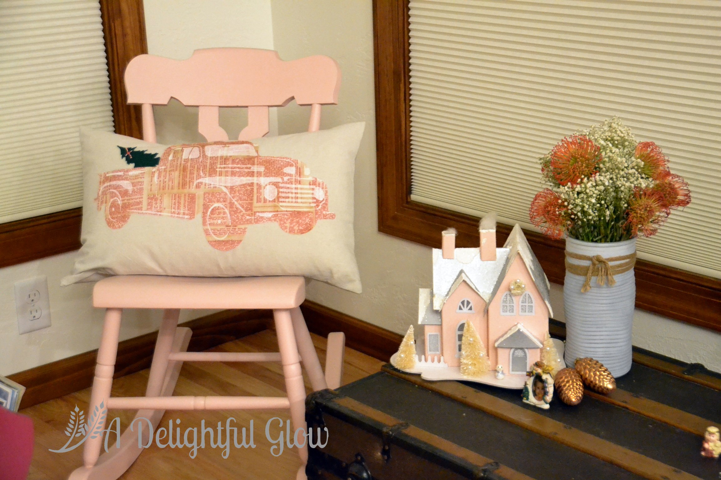 We put this pretty pink cottage over in this corner of the room, along with this cute pickup pillow from Sew a Fine Seam.
