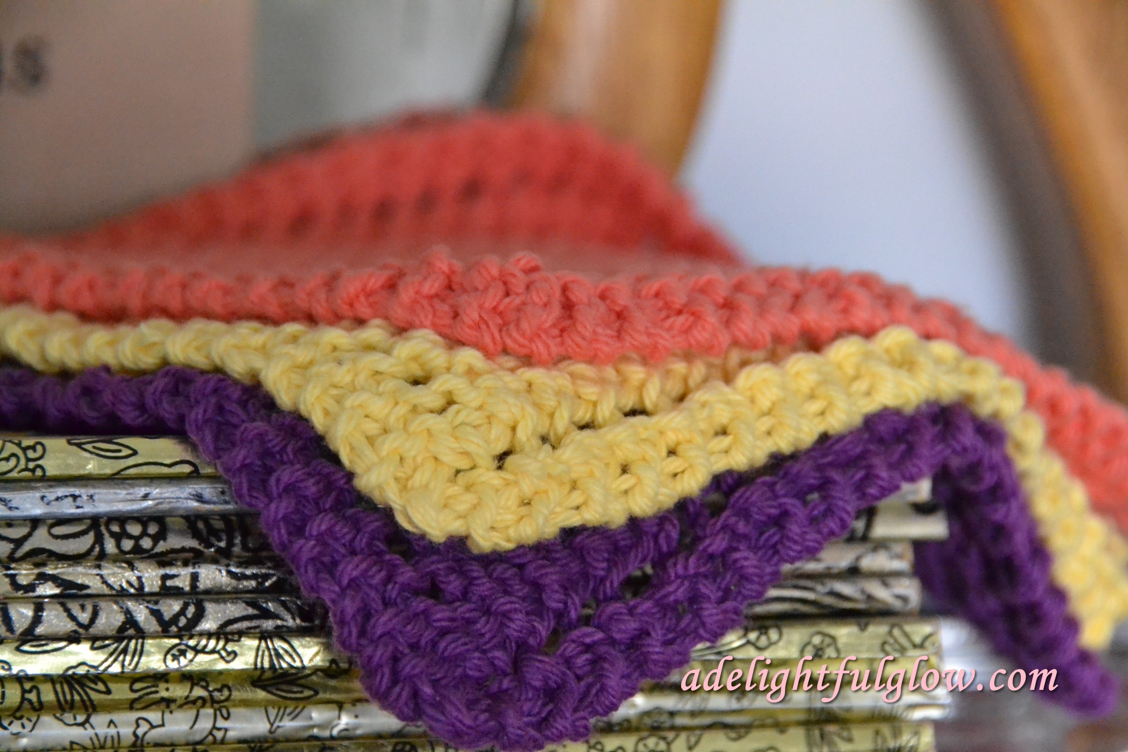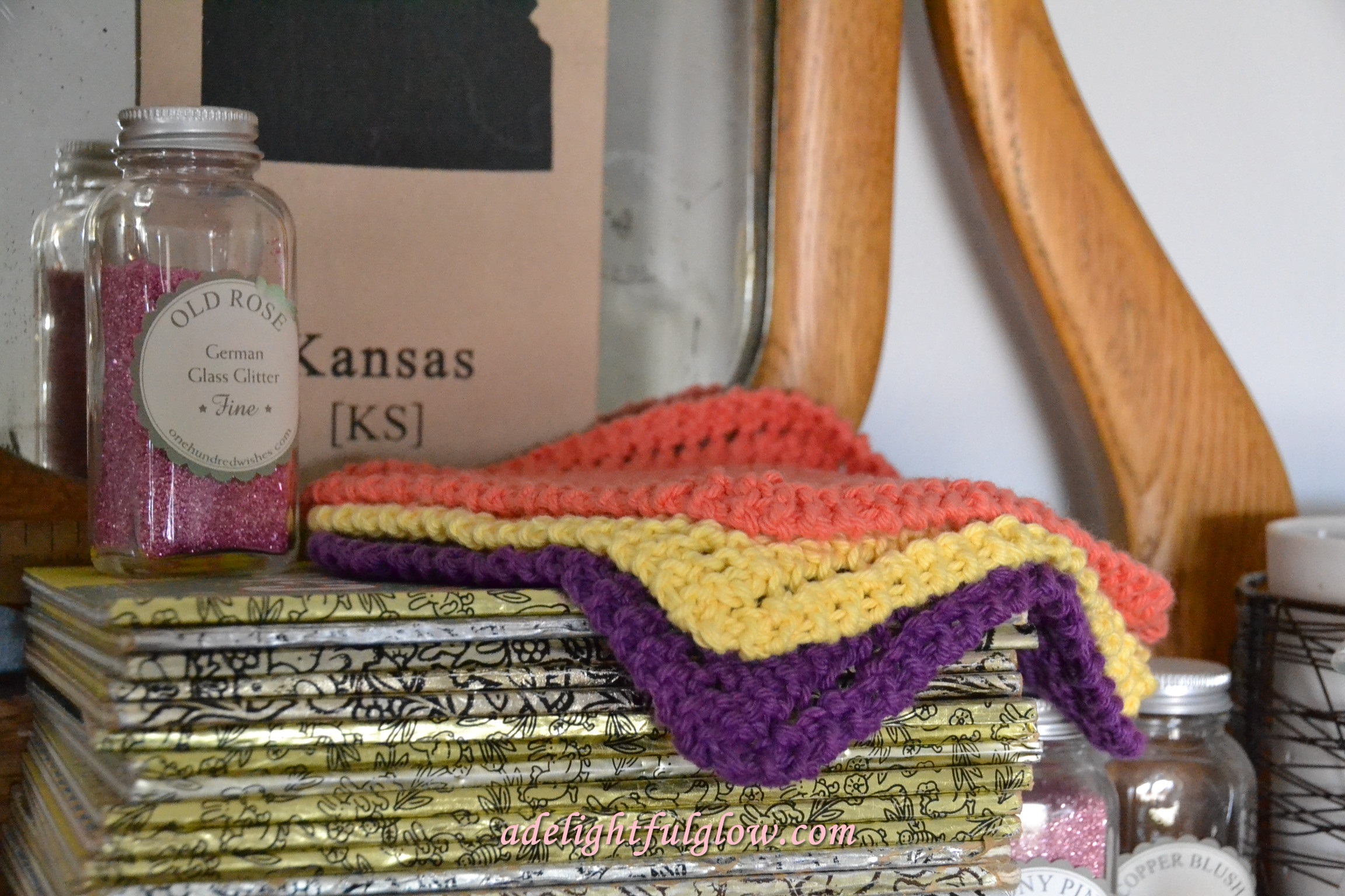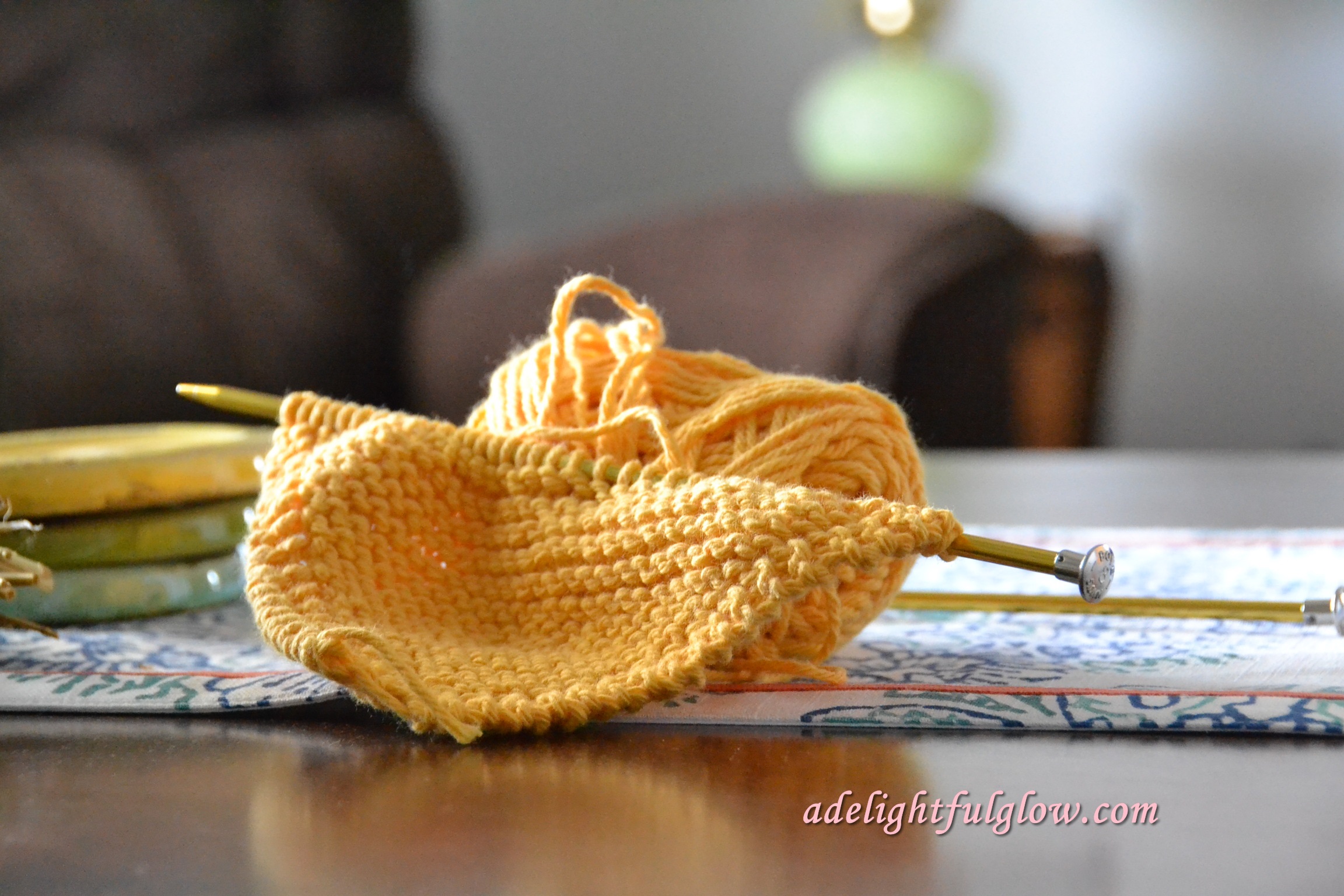 I mentioned last week I had the idea to make several solid dishcloths. My stack is started. I finished the yellow and moved onto a coral-ly pink, completed it ~yay!~ and pulled out a golden yellow. I had an orange-striped shirt on one day and was working with the golden yellow yarn. My daughter told me I looked Kansas-y. The yarn color reminded her of a sunflower and it went well with the orange. I liked her take on the colors.