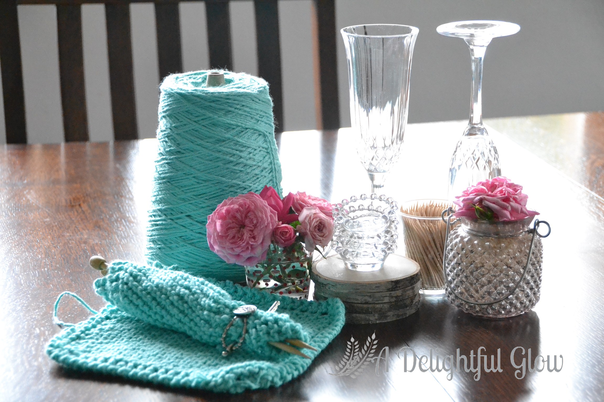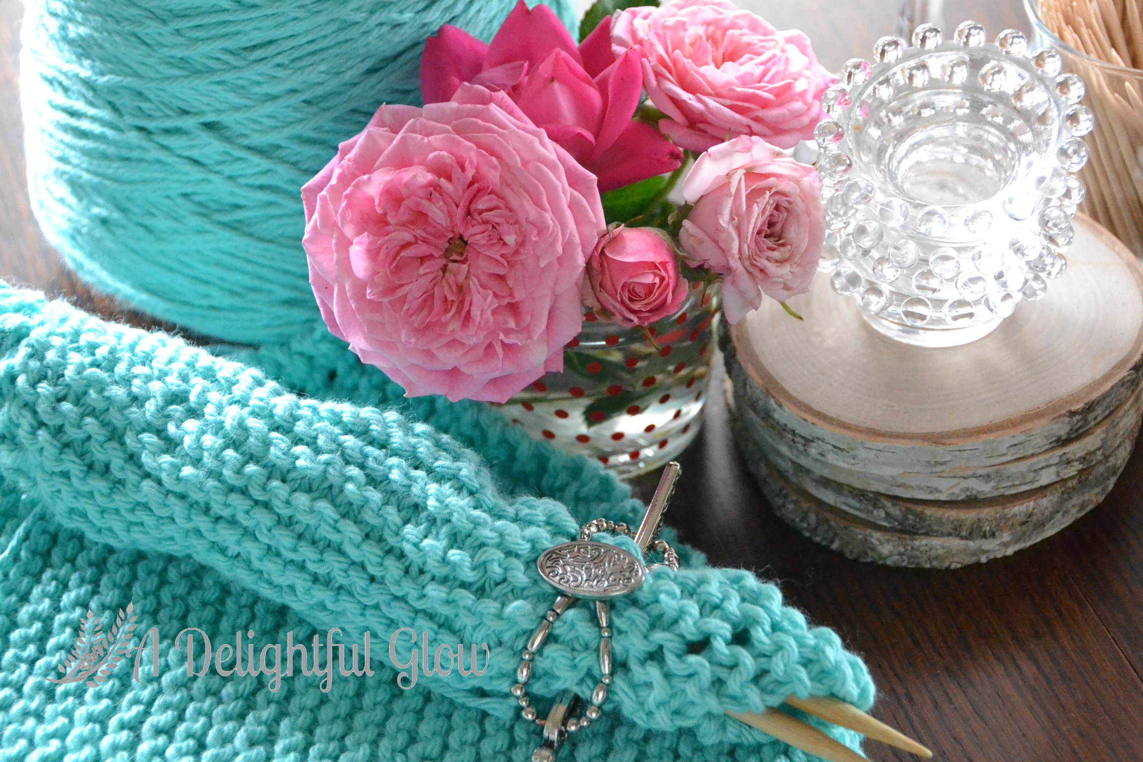 A close-up peek at the pretty aqua and the dishcloth and the pink roses and the flexi holding my project!