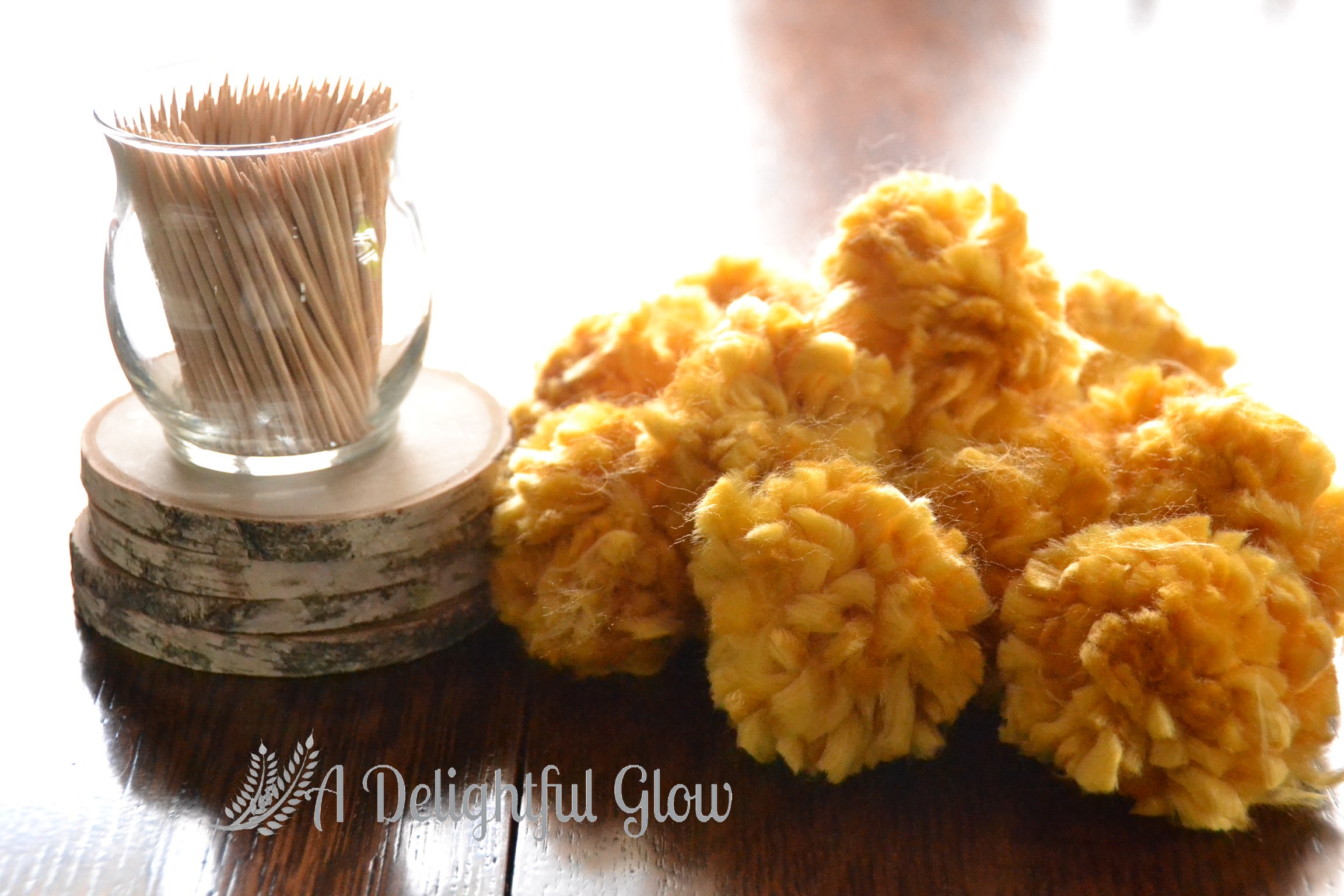 These pom-poms have been oh-so-patiently waiting. I keep spying the bag they’re in and I’m ready to pursue this project again. They just look harvest-y and summery to me. Whatcha think?
