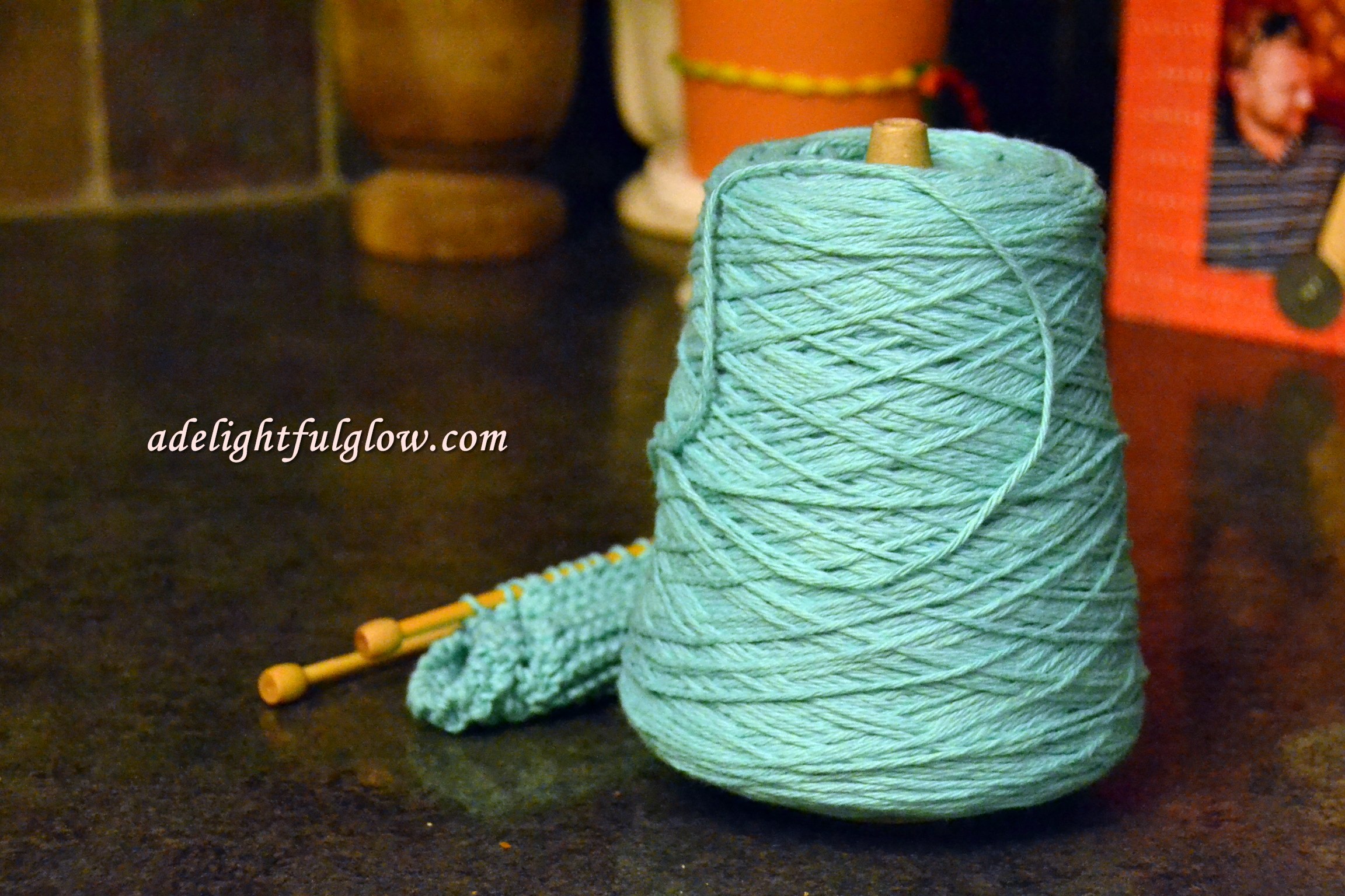 This big spool of yarn has been part of my decor. It looked so bright and lovely and springy I started in on a dishcloth with it. I have a dark green dishcloth going as well, but somehow the dark yarn was just not doing anything for me! Ha!